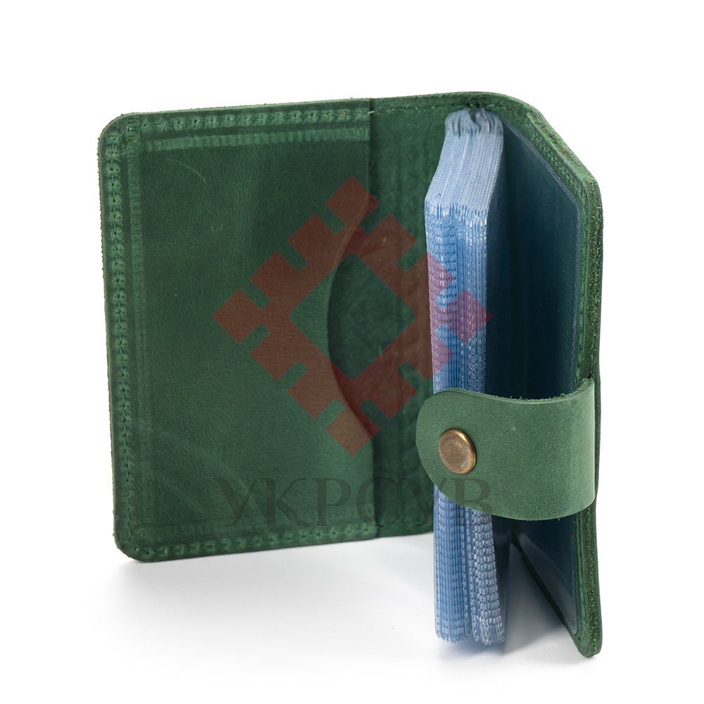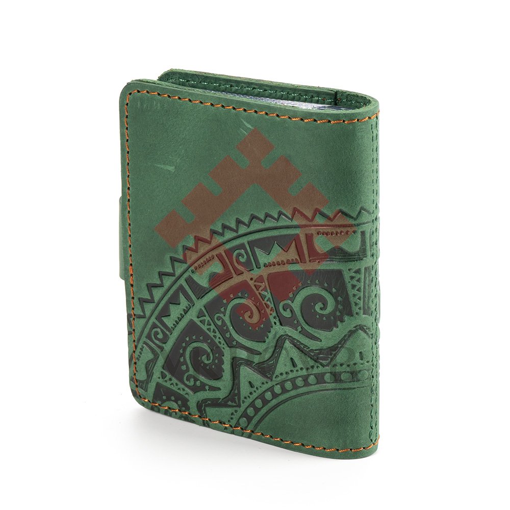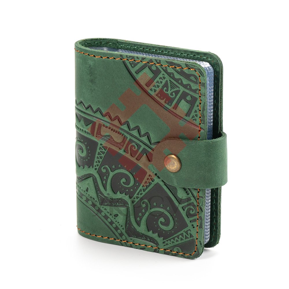 Візитниця "Півкола", зеленаОбкладинка виконана з натуральної шкіри з тисненням орнаменту. Ця візитниця буде надійно зберігати візитки, дисконтні або кредитні картки.Загальна інформація Матеріл: 100% шкіра |