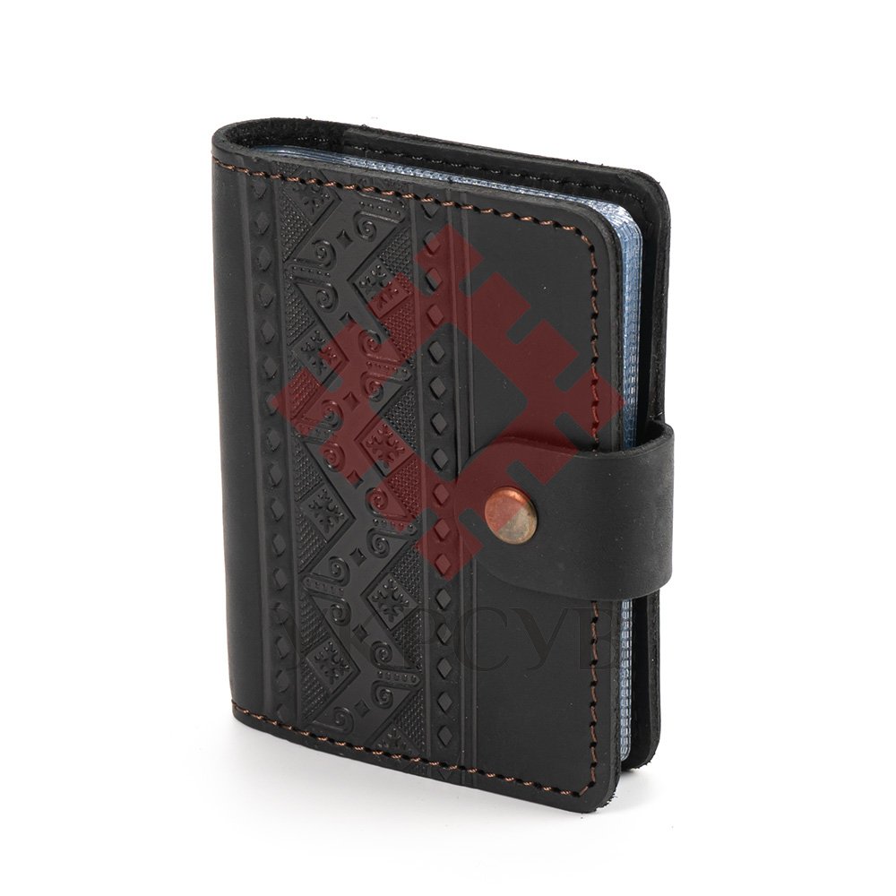Візитниця "Вишивка" чорнаОбкладинка виконана з натуральної шкіри з тисненням орнаменту. Ця візитниця буде надійно зберігати візитки, дисконтні або кредитні картки.Загальна інформація Матеріл: 100% шкіра |