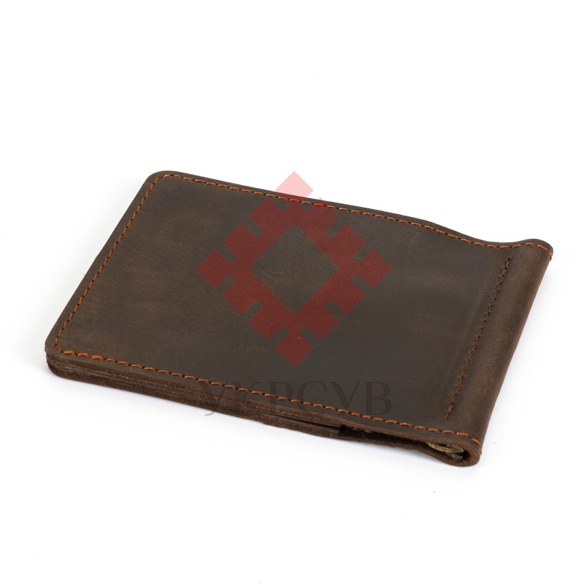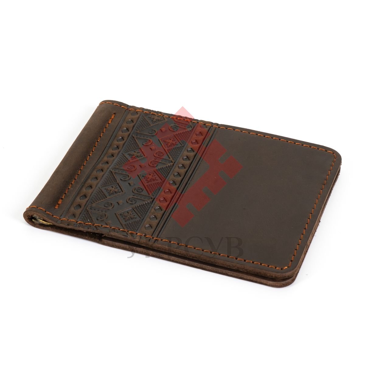 Зажим для грошей "Вишивка", темно-коричневийЗажим виконаний з натуральної шкіри та прикрашений візерунком, що виконаний у техніці тиснення. Такий зажим буде практичним, довговічним та зручним у використанні. Всередині є окремі два відділи для карток.Загальна інформація Матеріл: 100% шкіра