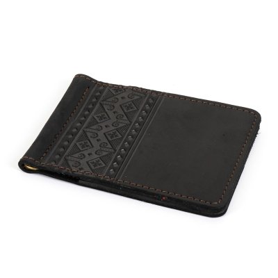 Зажим для грошей "Вишивка", чорнийЗажим виконаний з натуральної шкіри та прикрашений візерунком, що виконаний у техніці тиснення. Такий зажим буде практичним, довговічним та зручним у використанні. Всередині є окремі два відділи для карток.Загальна інформація Матеріл: 100% шкіра