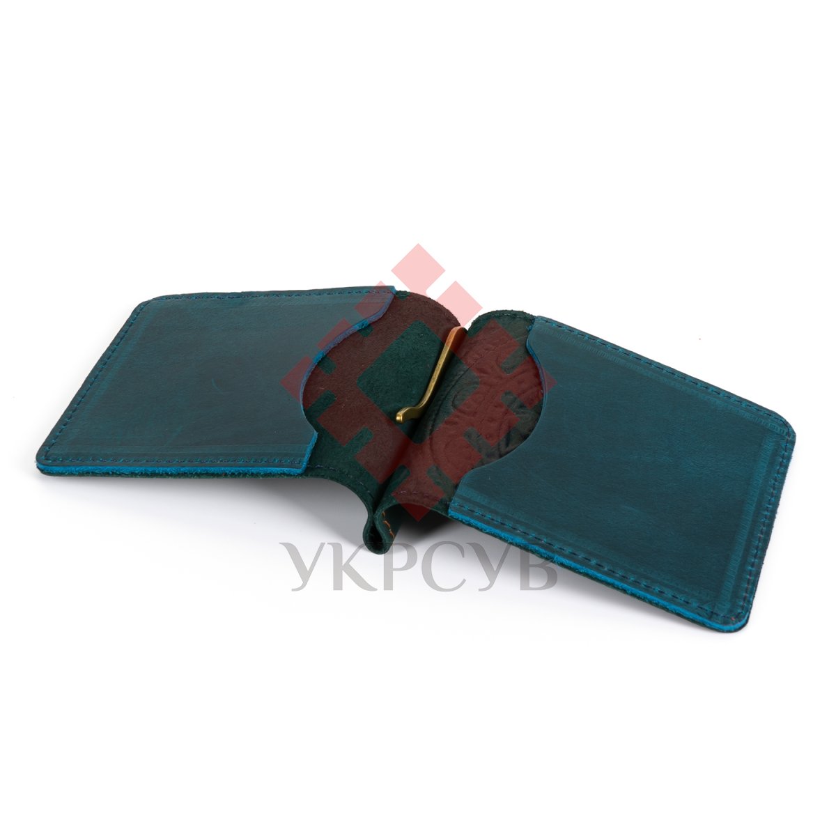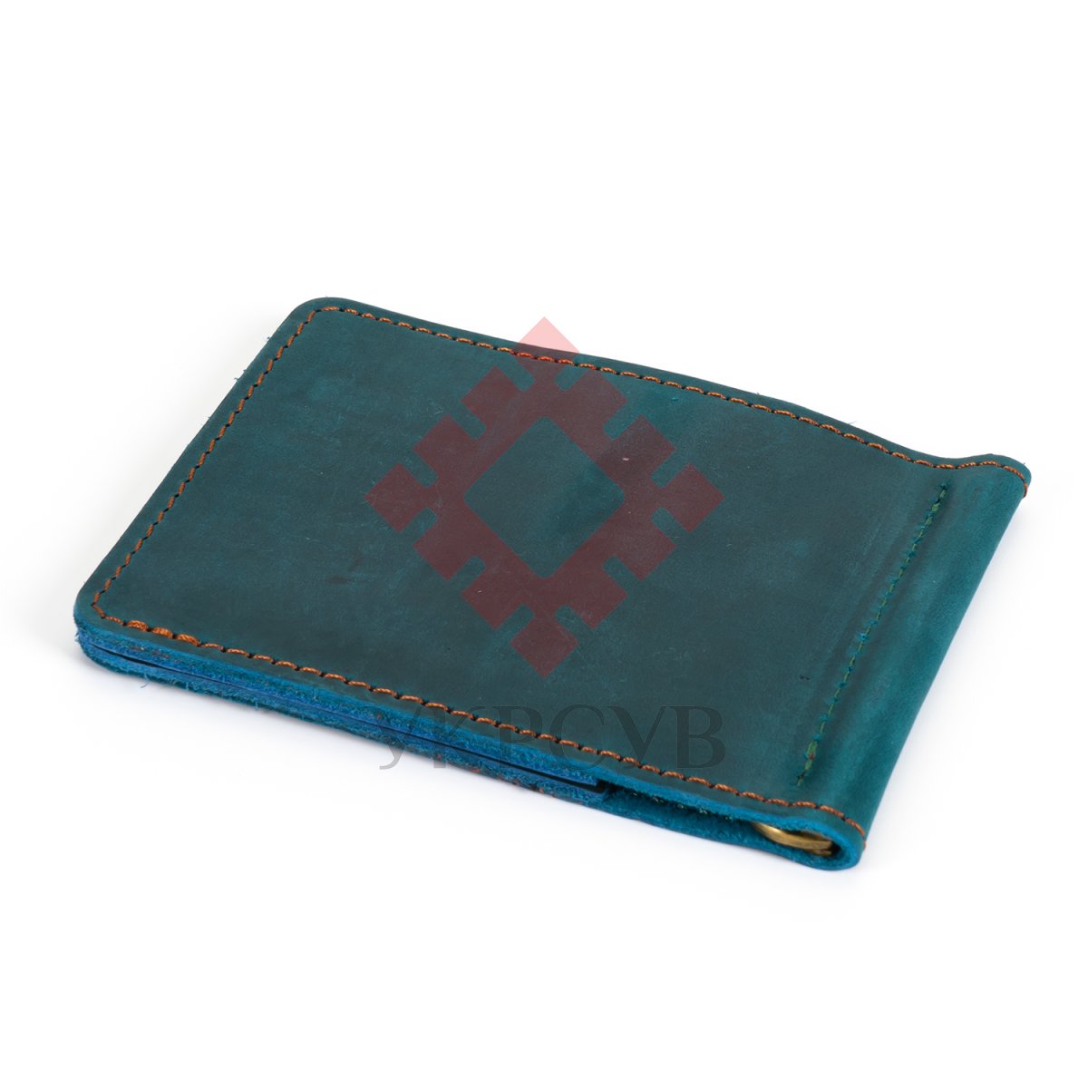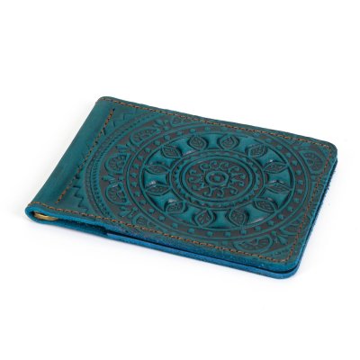 Зажим для грошей "Сонечко", бірюзаЗажим виконаний з натуральної шкіри та прикрашений візерунком, що виконаний у техніці тиснення. Такий зажим буде практичним, довговічним та зручним у використанні. Всередині є окремі два відділи для карток.Загальна інформація Матеріл: 100% шкіра