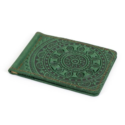 Зажим для грошей "Сонечко", зеленийЗажим виконаний з натуральної шкіри та прикрашений візерунком, що виконаний у техніці тиснення. Такий зажим буде практичним, довговічним та зручним у використанні. Всередині є окремі два відділи для карток.Загальна інформація Матеріл: 100% шкіра