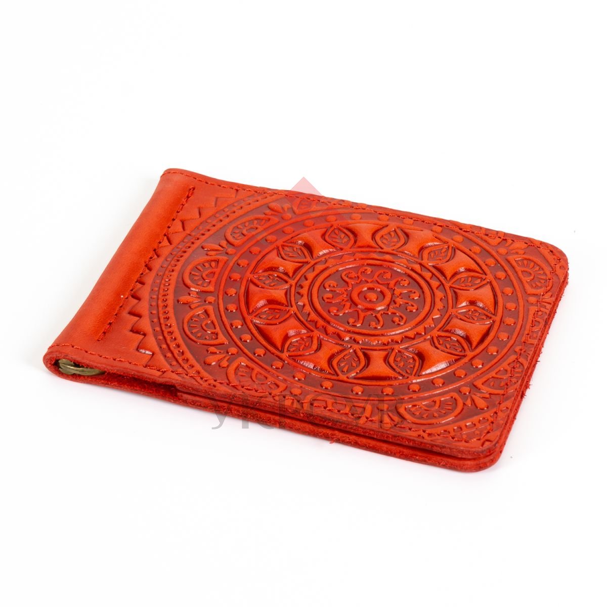 Зажим для грошей "Сонечко", червонийЗажим виконаний з натуральної шкіри та прикрашений візерунком, що виконаний у техніці тиснення. Такий зажим буде практичним, довговічним та зручним у використанні. Всередині є окремі два відділи для карток.Загальна інформація Матеріл: 100% шкіра