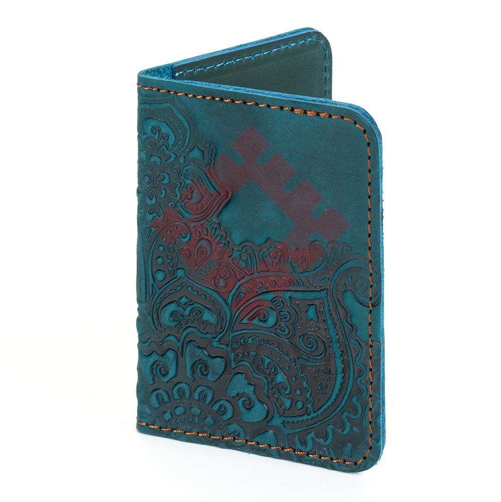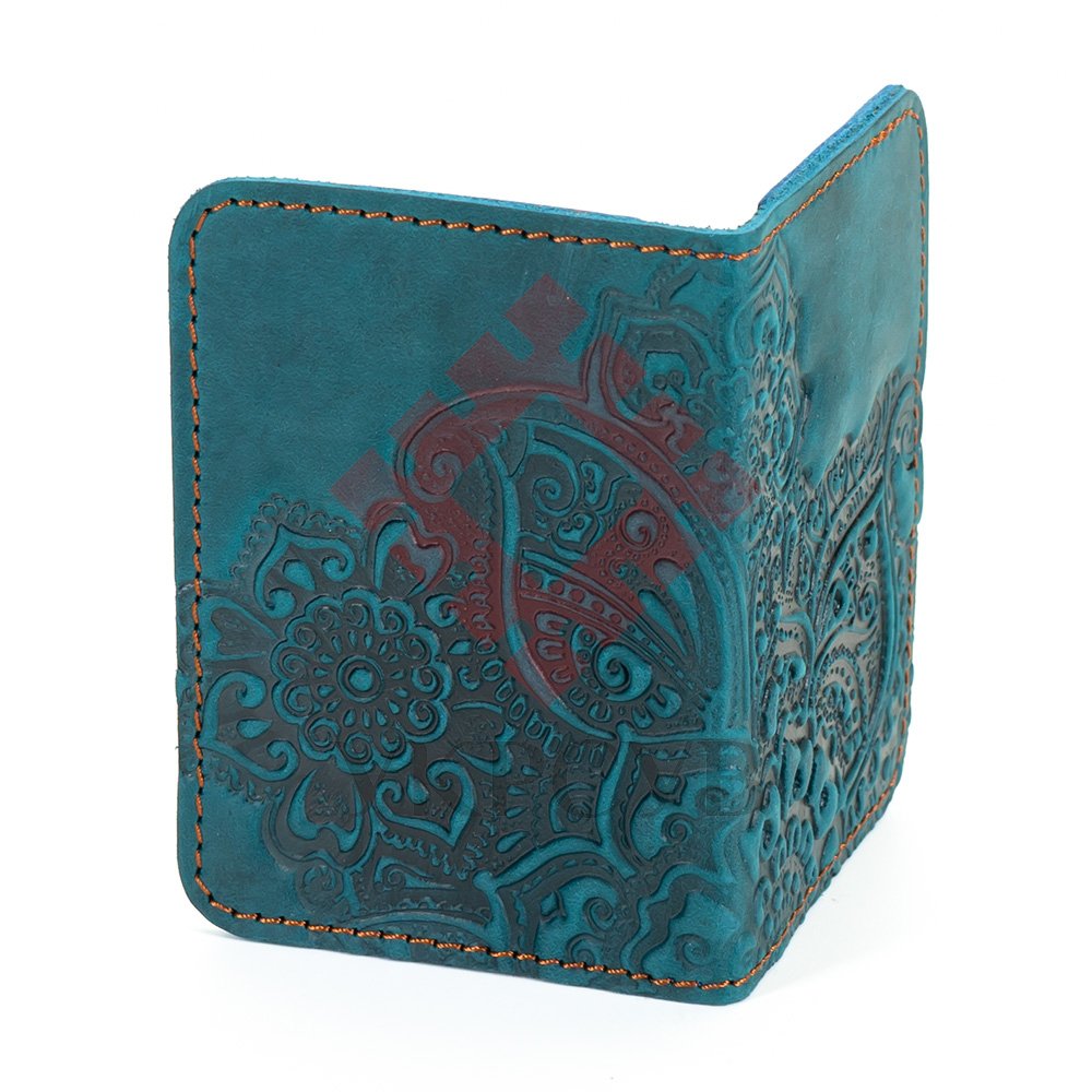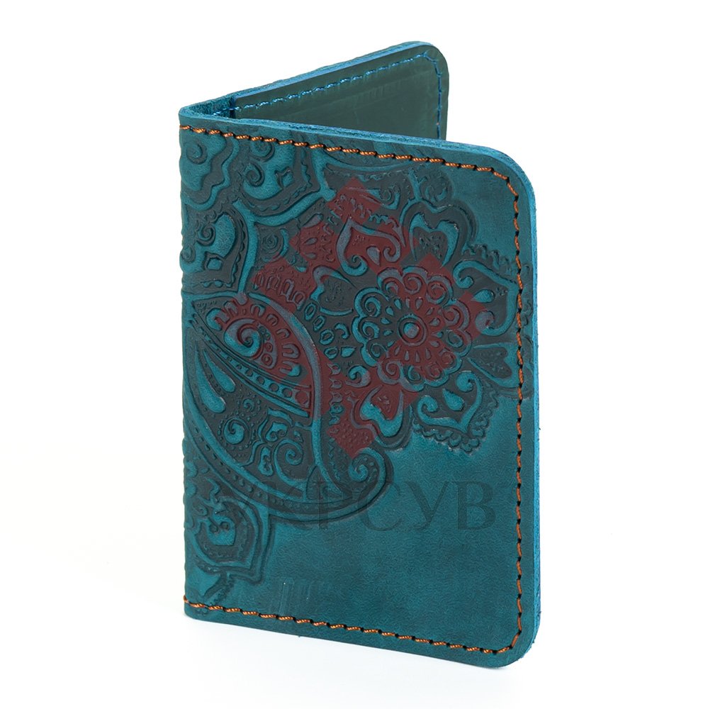 Обкладинка для ID картки "Квіти", бірюзаОбкладинка виконана з натуральної шкіри з тисненням візерунку. Такий чохол буде надійно та довговічно захищати картки від пошкоджень.Загальна інформація: Матеріал: 100% шкіра |