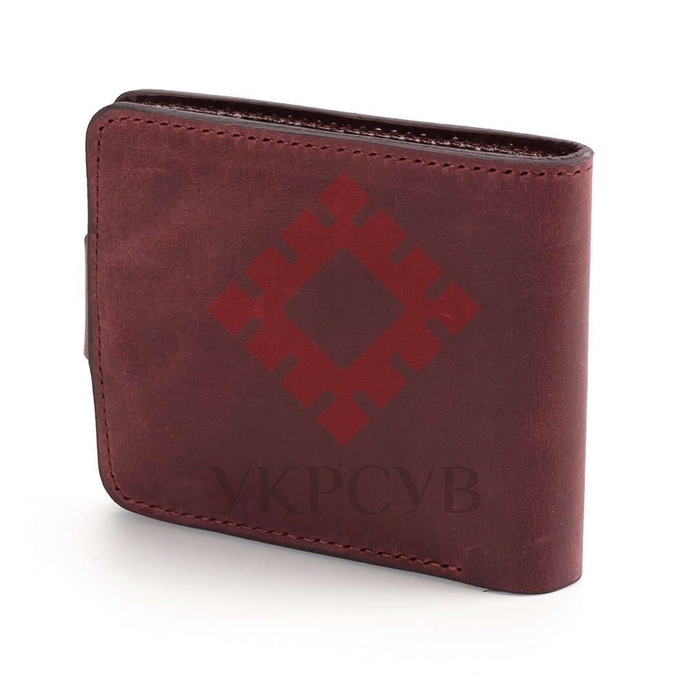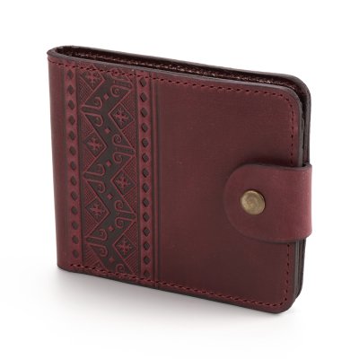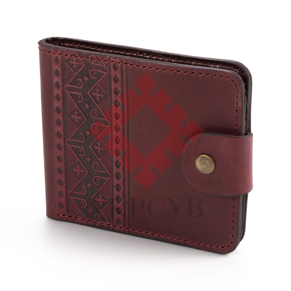 Гаманець малий "Вишивка"Гаманець виконаний з натуральної шкіри, з тисненням візерунку. Гаманець має два відділи для купюр, один відділ для монет, один - для фото та 5 відділів для карток. Загальна інформація: Матеріал: 100% шкіра