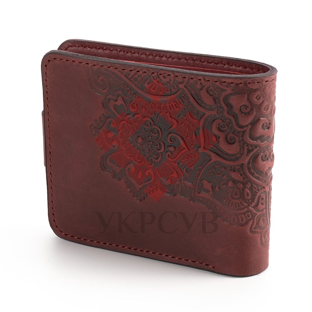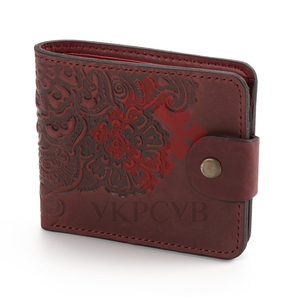 Гаманець малий "Квіти"Гаманець виконаний з натуральної шкіри, з тисненням візерунку. Гаманець має два відділи для купюр, один відділ для монет, один - для фото та 5 відділів для карток. Загальна інформація: Матеріал: 100% шкіра