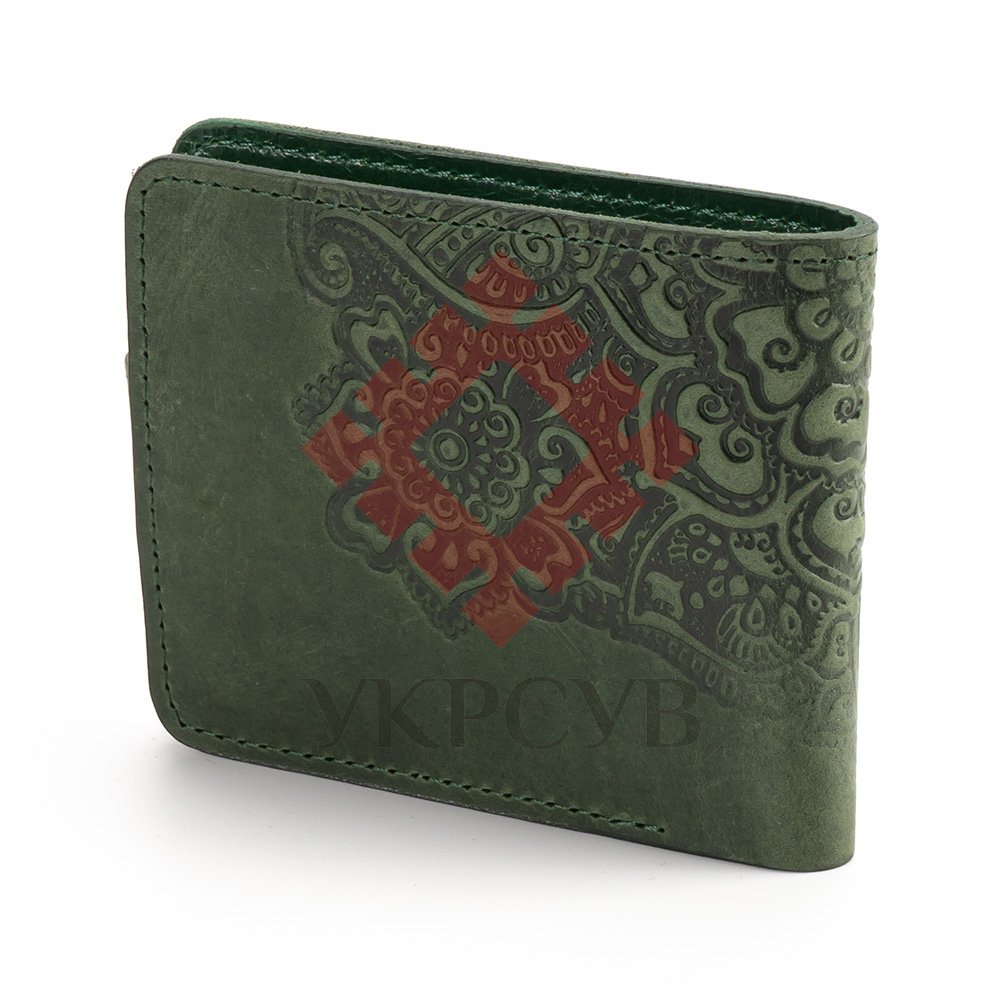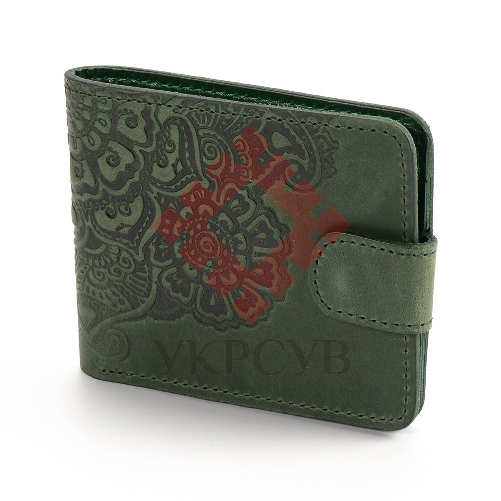 Гаманець малий "Квіти"Гаманець виконаний з натуральної шкіри, з тисненням візерунку. Гаманець має два відділи для купюр, один відділ для монет, один - для фото та 5 відділів для карток. Загальна інформація: Матеріал: 100% шкіра