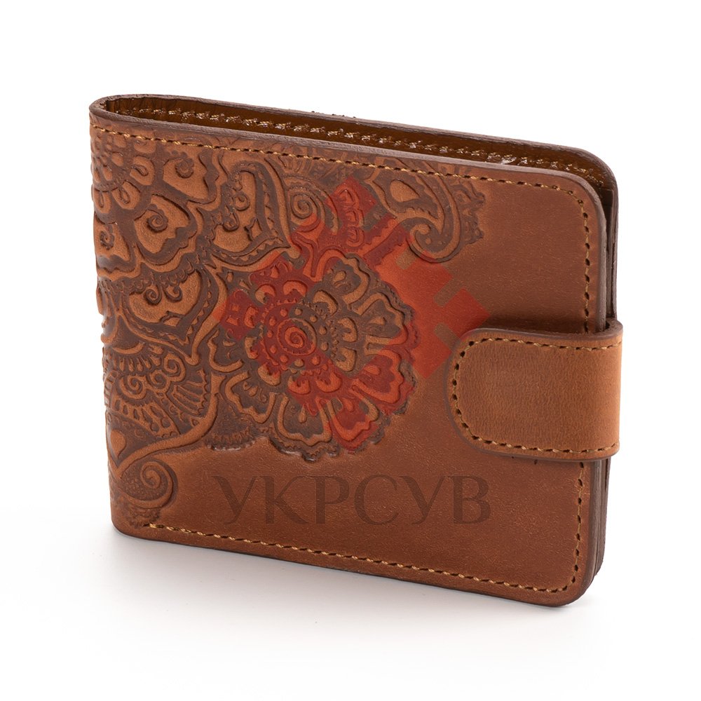 Гаманець малий "Квіти"Гаманець виконаний з натуральної шкіри, з тисненням візерунку. Гаманець має два відділи для купюр, один відділ для монет, один - для фото та 5 відділів для карток. Загальна інформація: Матеріал: 100% шкіра