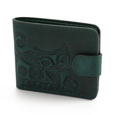 Гаманець малий "Котик"Гаманець виконаний з натуральної шкіри, з тисненням візерунку. Гаманець має два відділи для купюр, один відділ для монет, один - для фото та 5 відділів для карток. Загальна інформація: Матеріал: 100% шкіра