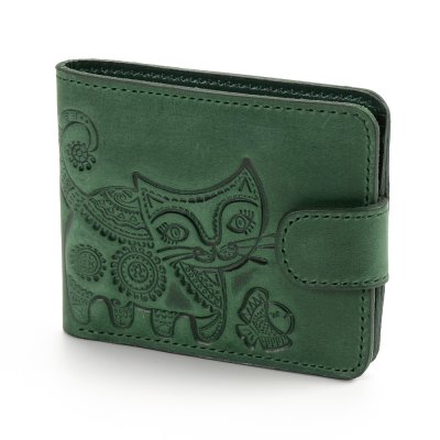 Гаманець малий "Котик"Гаманець виконаний з натуральної шкіри, з тисненням візерунку. Гаманець має два відділи для купюр, один відділ для монет, один - для фото та 5 відділів для карток. Загальна інформація: Матеріал: 100% шкіра