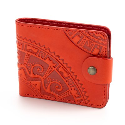 Гаманець малий "Півкола"Гаманець виконаний з натуральної шкіри, з тисненням візерунку. Гаманець має два відділи для купюр, один відділ для монет, один - для фото та 5 відділів для карток. Загальна інформація: Матеріал: 100% шкіра