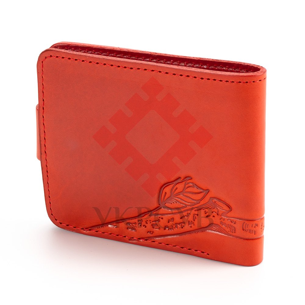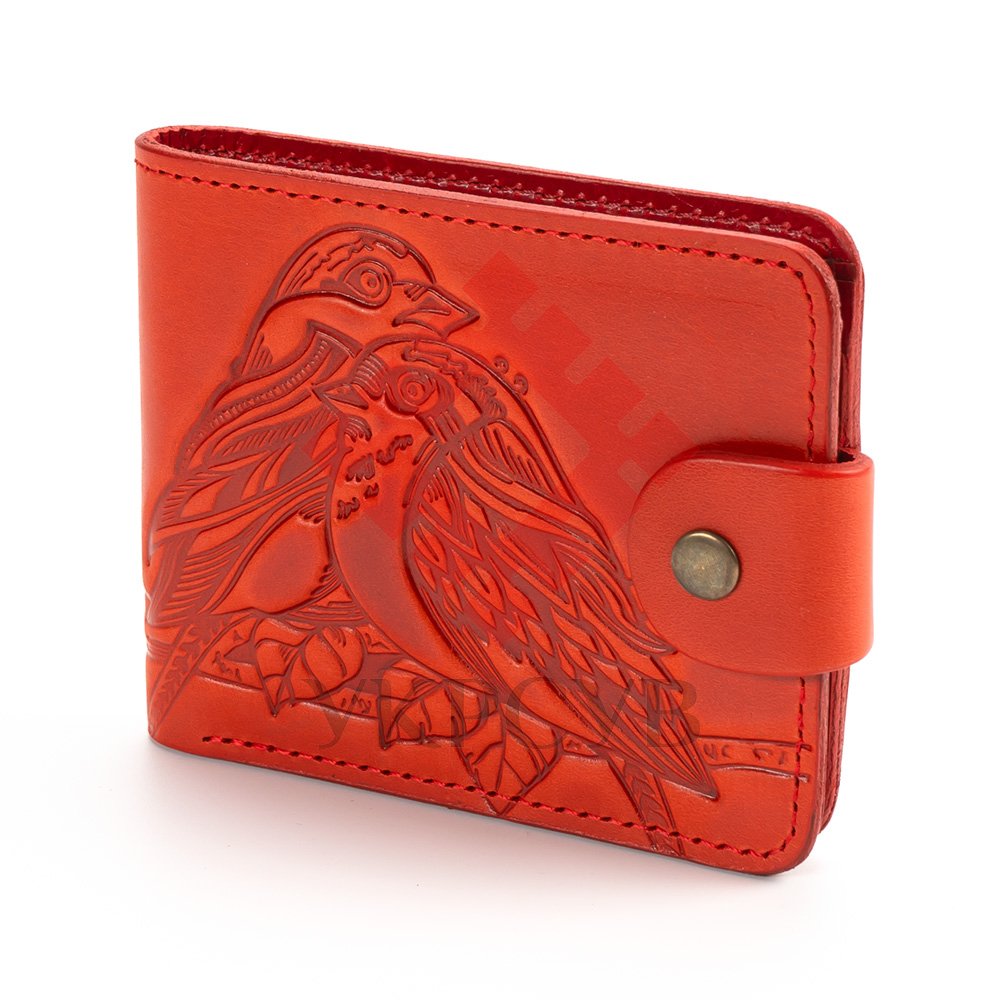 Гаманець малий "Пташки"Гаманець виконаний з натуральної шкіри, з тисненням візерунку. Гаманець має два відділи для купюр, один відділ для монет, один - для фото та 5 відділів для карток. Загальна інформація: Матеріал: 100% шкіра