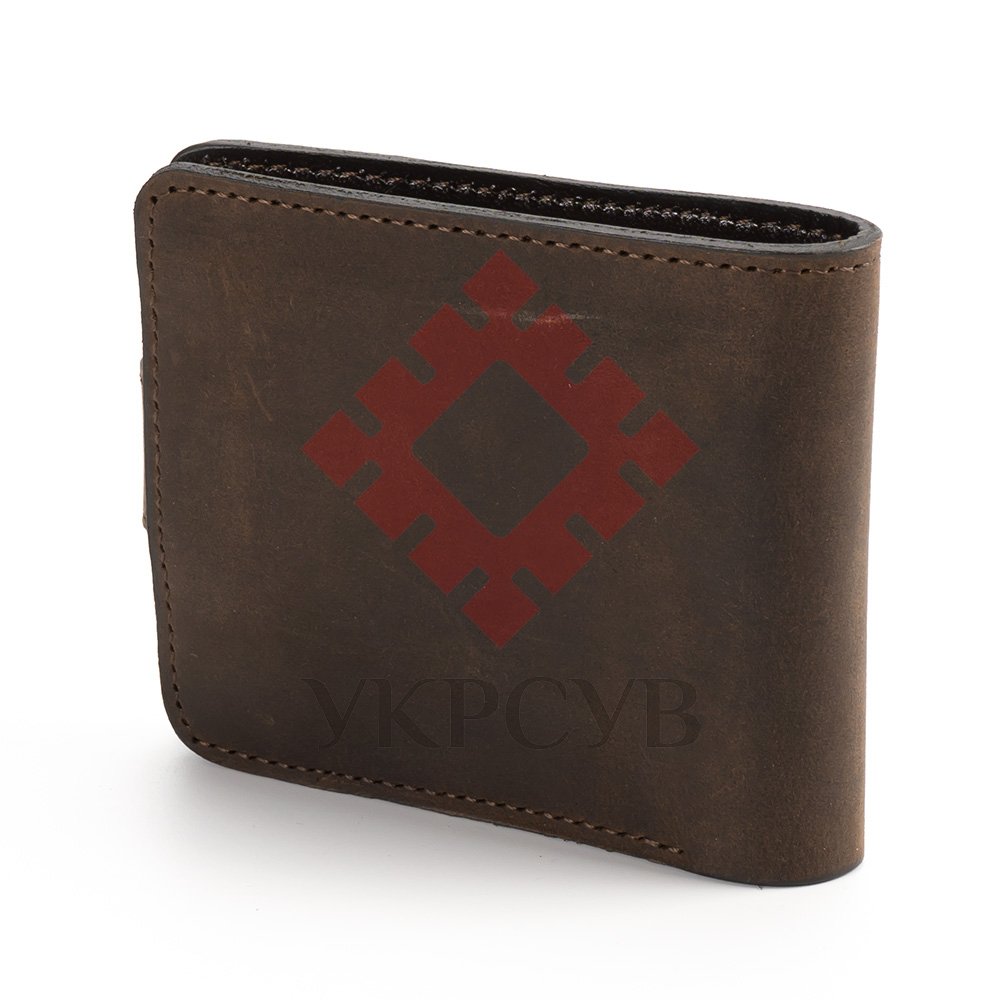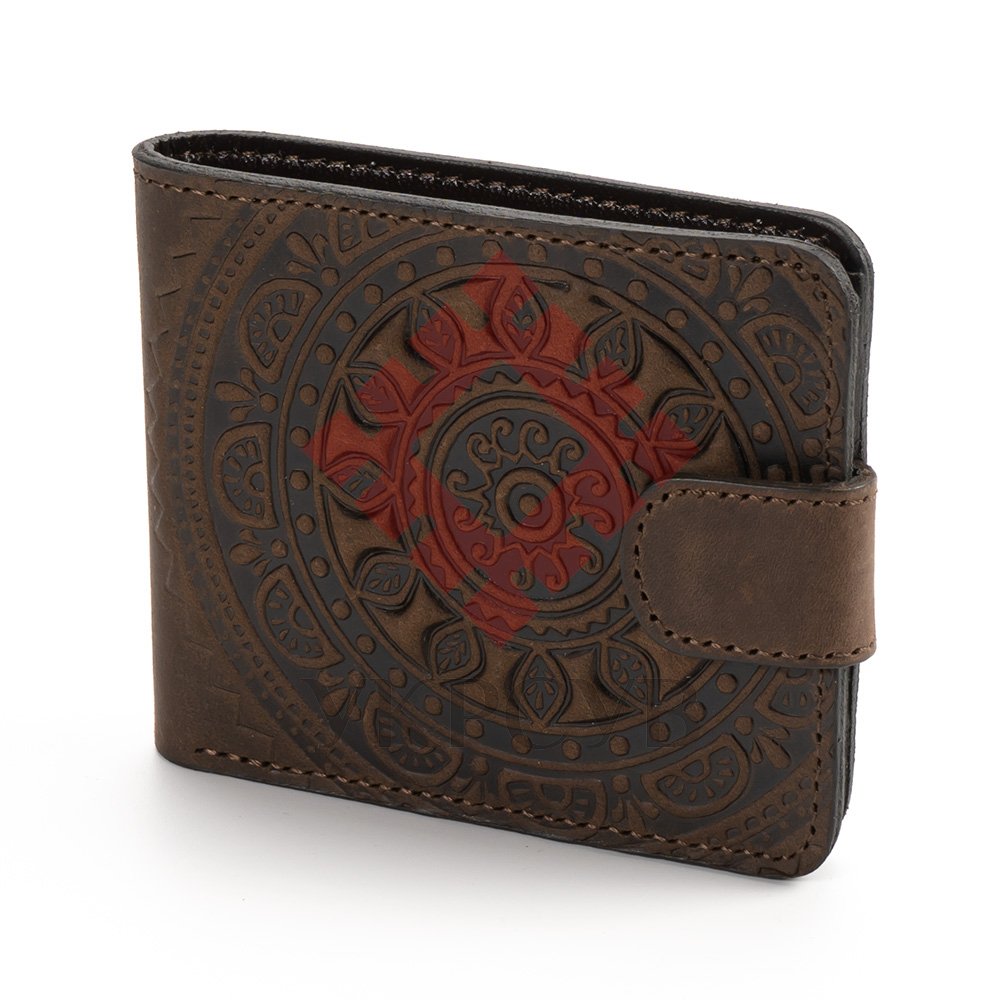 Гаманець малий "Сонечко"Гаманець виконаний з натуральної шкіри, з тисненням візерунку. Гаманець має два відділи для купюр, один відділ для монет, один - для фото та 5 відділів для карток. Загальна інформація: Матеріал: 100% шкіра