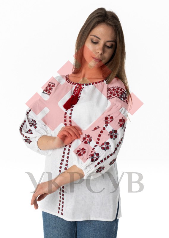 Вишиванка жіноча Слобожанка - ВсеславаВишиванка виготовлена з натурального 100% льону та прикрашена делікатною традиційною вишивкою хрестиком у чорно-червоних тонах. Загальна інформація: Тканина: 100% - льон Догляд: Прання: