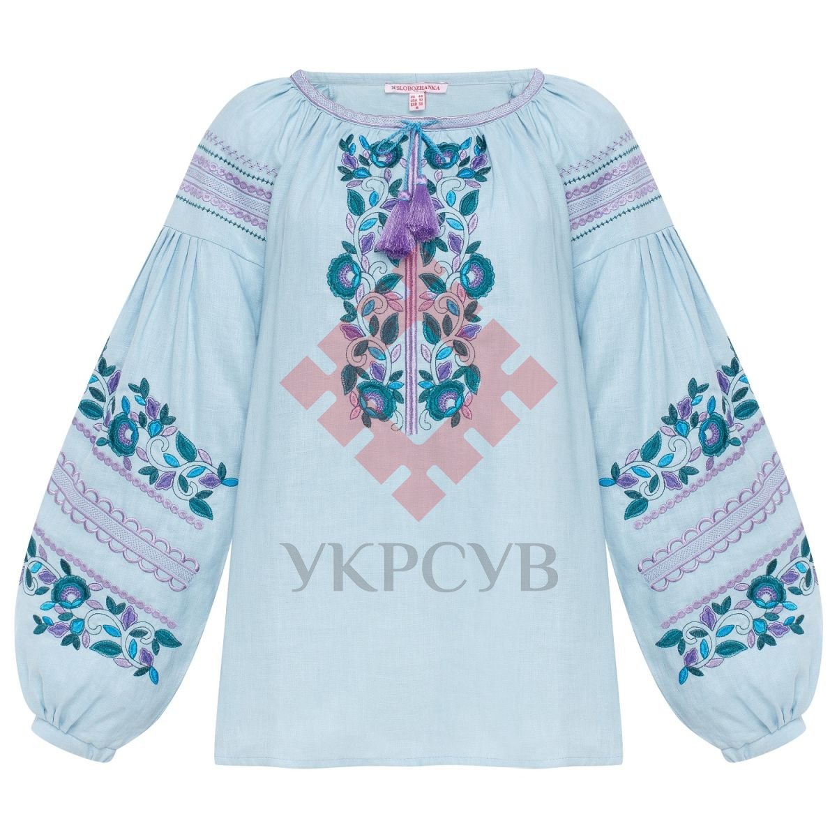 Вишиванка жіноча Слобожанка - Вітана (блакитна)Ця вишиванка небесно-блакитного кольору вигідно підкреслить яскравість Вашої натури. Дана модель цільного крою, прямого силуету, з довгим рукавом, горловина оздоблена обшивкою і регулюється за допомогою крученого шнура з китицями. Вишивка виконана гладдю бузково-смарагдовими нитками та прикрашає рукави і перед сорочки. В основі орнаменту квіткові та геометричні елементи. Загальна інформація: Тканина: 100% - льон Догляд: Прання: