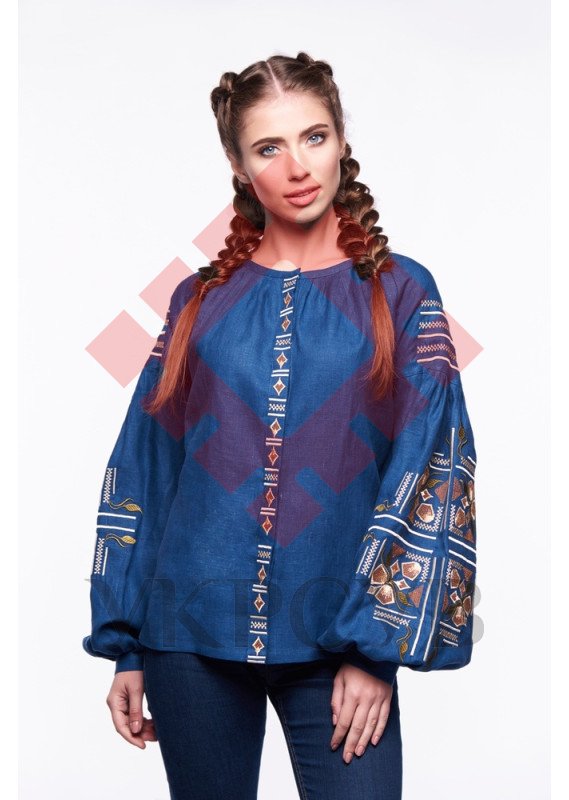 Блуза вишиванка "Слобожанка" - Яра (синій льон)Вишиванка виготовлена з натурального льону насиченого синього кольору: Така сорочка – вишукане українське вбрання. Здавна вважали, що синій колір є символом очищення, душевного спокою і позбавлення від хвороб. Лляна тканина є натуральною, зберігає свій колір навіть після багаторазового прання. Бежево-коричневі візерунки гарно виділяються на синьому полотні. Якісна машинна вишивка виконана у техніці гладь. Приховані застібки-кнопки розміщені уздовж вишивки (від горловини до нижньої частини виробу). Вільний крій вишиванки та широкі рукави не обмежують рухи, дозволяють почуватися комфортно.Характер орнаменту: геометричний Загальна інформація Виготовлено в Україні. Догляд: Прання: