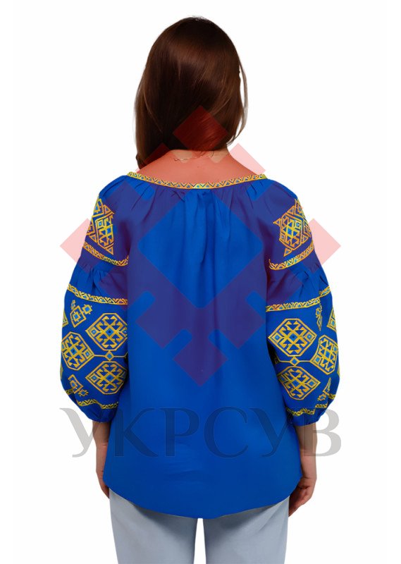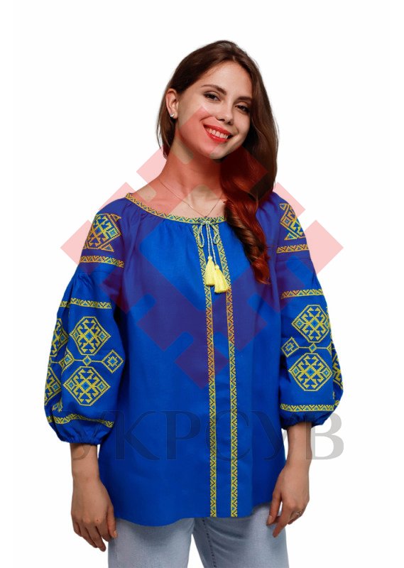 Блуза вишиванка "Слобожанка" - Світодара (індіго, жовта вишивка)Вишиванка виготовлена з натурального льону кольору індіго. Дана модель цільного крою, прямого силуету, рукав реглан, горловина оздоблена обшивкою і регулюється за допомогою крученого шнура з китицями. Вишивка виконана хрестиком та прикрашає рукави і перед сорочки. Основним елементом орнаменту є ромб - символ чоловічого і жіночого начала, гармонії, повноти, краси, любові. У кожному ромбі міститься крапка чи маленький хрестик - символ зерна, що проростає.Характер орнаменту: геометричний Загальна інформація Виготовлено в Україні. Догляд: Прання: