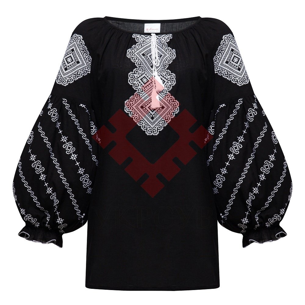 Вишиванка жіноча Колос - Ніжність, чорно-білаВишиванка чорного кольору: цей колір називають кольором Землі і вважають знаком родючості і успіху в починаннях. Цей колір є провідником мудрості і знань. Колір вишивки – білий: цей колір - джерело чистоти і святості. Характер орнаменту: геометричний Символика: ромб – Ромб - символ родючості і жіночого начала. Орнаменти з ромбами є сильним захисним оберегом, приносять удачу. Згідно з давньою слов'янською культурою, ромби представляють богиню Землі, яка сприяє родючості. Символ берегині - поширений символ в українській вишивці, символізує жінку-природу, жінку-матір, дерево життя. Підкреслює, що кожен живий організм на землі є невід'ємною частиною цілого організму Землі. Загальна інформація Тканина: 100% бавовна. Догляд: Прання: