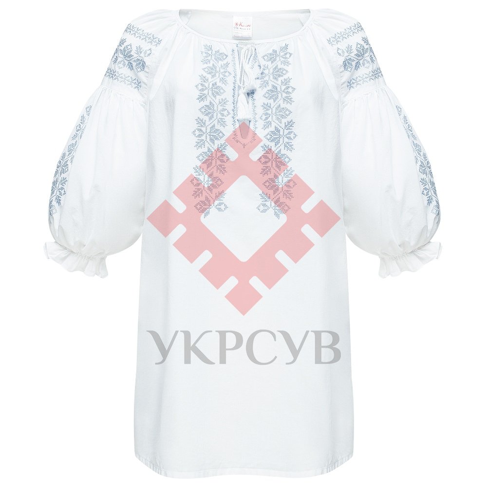 Блуза жіноча вишиванка Колос - Хміль (блакитна вишивка, короткий рукав)Вишиванка білого кольору: це символ чистоти і життєвої енергії. За стародавнім повір'ям біла вишиванка дарує своєму власникові душевну рівновагу і здоров'я. Вишиванка з ніжним візерунком. Вишивка виконана в техніці «хреста», ніжно-блакитними нитками по білому.Загальна інформація Тканина: Батист Догляд: Прання: