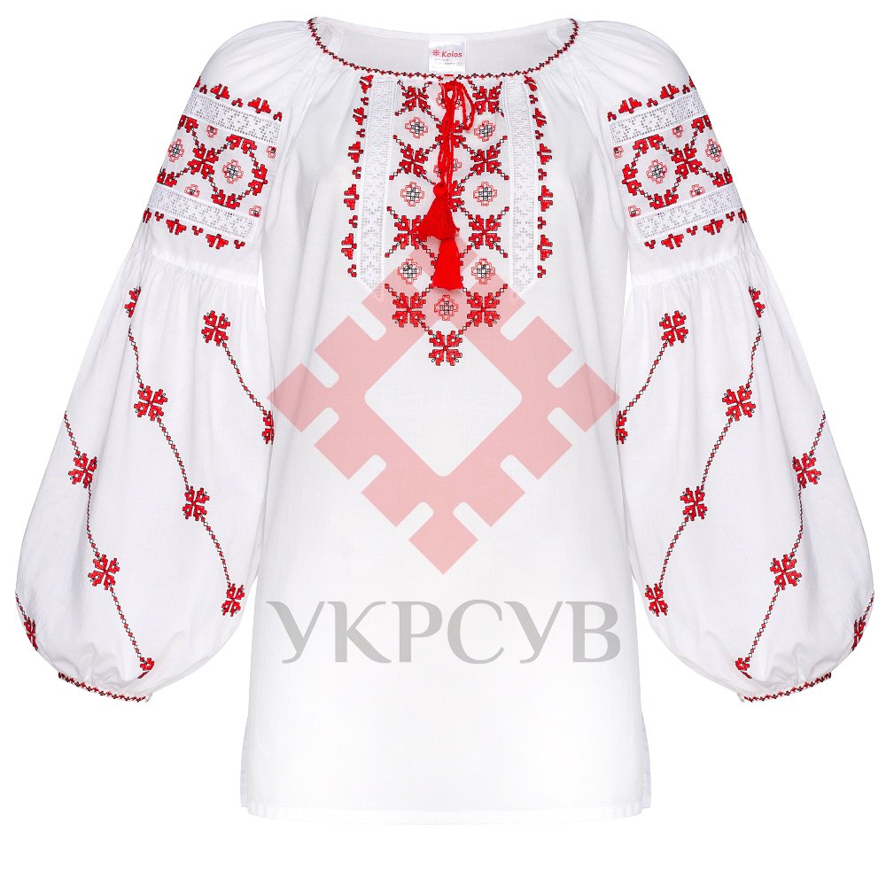 Вишиванка жіноча Колос - Василина, червонаВишиванка білого кольору: це символ чистоти і життєвої енергії. За стародавнім повір'ям біла вишиванка дарує своєму власникові душевну рівновагу і здоров'я. Кольори вишивки – Червоний, чорний. Червоний колір у вишивці означає радість, пристрасть, любов і життєлюбність. Чорний - символ годувальниці землі, родючості і достатку. Вишивка доповнена елементами мережки, яка робить цю модель вишиванки жіночною та ошатною. Характер орнаменту: геометричний. Загальна інформація Тканина: 100% бавовна (батист). Догляд: Прання: