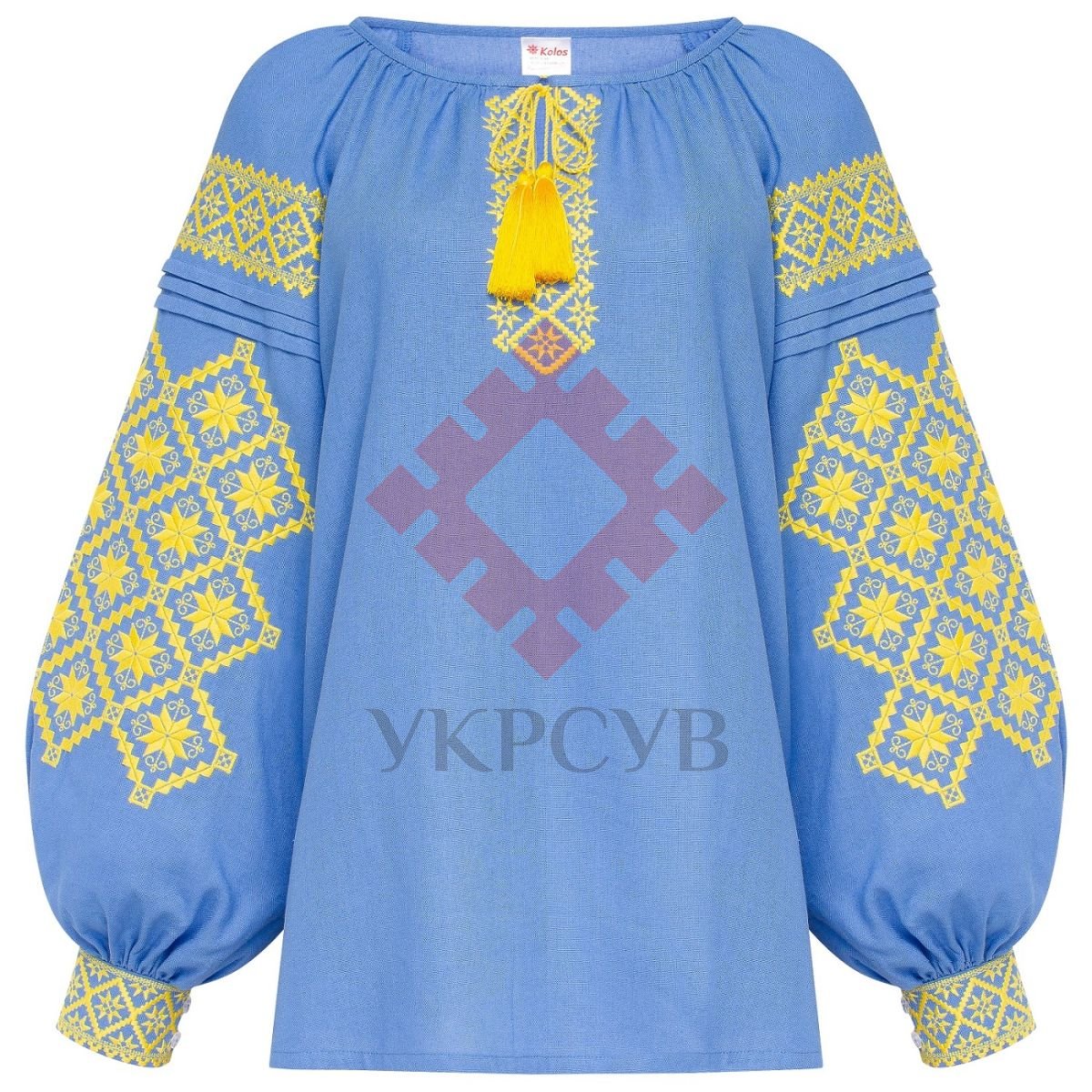 Вишиванка жіноча Колос - Берегиня (блакитна)Вишиванка виготовлена з натурального льону та прикрашена ніжним традиційним візерунком. Вишивка виконана у техніці "гладь" (машинна вишивка) та прикрашає вишиванку на рукавах та грудях. Загальна інформація Тканина: 97% - льон, 3% - поліестер Догляд: Прання: