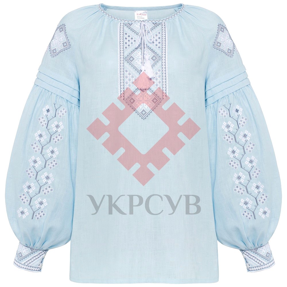 Блуза жіноча вишиванка Колос - Яблуневий цвіт (блакитна)Вишиванка виготовлена з натурального льону ніжного блакитного кольору: у поєднанні з вишивкою хрестиком, елементами мережки та бездоганним кроєм, ця вишиванка створить стильний та жіночний образ. Жіноча вишиванка з сучасно-традиційним орнаментом вишивки. Дана модель приваблює своєю простотою і вишуканістю.Загальна інформація Тканина: Льон Догляд: Прання: