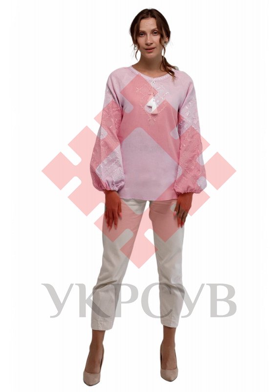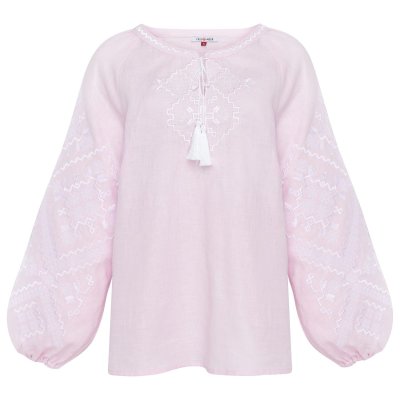 Вишиванка жіноча Фолк Мода (1902)Вишиванка виготовлена з натурального 100% льону ніжного рожевого кольору. Делікатна вишивка гладдю, у тон тканини, прикрашає вишиванку спереду та на рукавах. Загальна інформація: Тканина: 100% - льон Догляд: Прання: