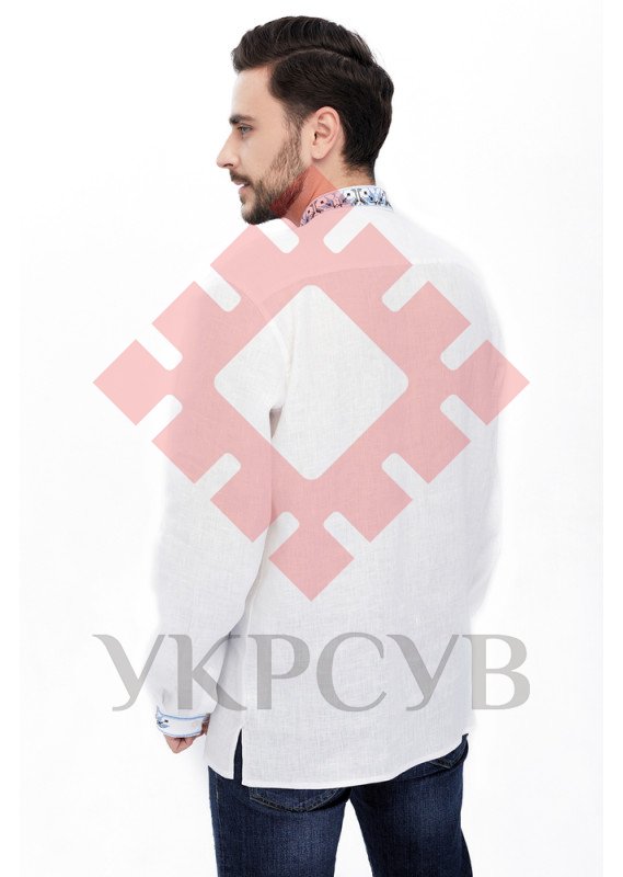 Сорочка чоловіча вишиванка Мирослав - СлобожанкаВишиванка білого кольору: це символ чистоти і життєвої енергії. За стародавнім повір'ям біла вишиванка дарує своєму власникові душевну рівновагу і здоров'я. Колір вишивки – синій та блакитний: це кольори небосхилу і води. Є символом очищення, душевного спокою та позбавлення від хвороб. Характер орнаменту: геометричний Символика: ромб – орнаменти з ромбами є сильним захисним оберегом, приносять удачу. Згідно з давньою слов'янській культурі, ромби представляють богиню Землі, яка сприяє родючості. Загальна інформація Тканина: льон