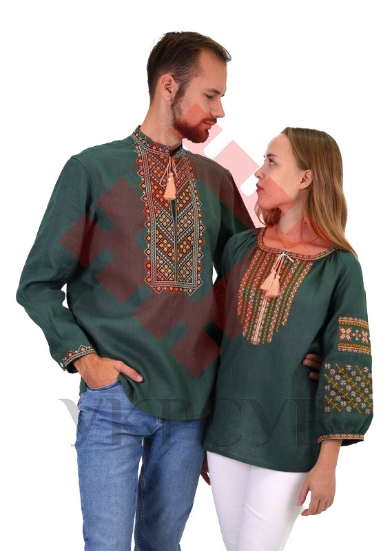 Сорочка вишиванка чоловіча Слобожанка - БажанВишиванка виготовлена з натурального льону насиченого зеленого кольору: це символ народження, зростання та процвітання. Кольори вишивки – золотавий, коричневий та помаранчевий. Акуратна вишивка хрестиком розміщена спереду вишиванки, на комірці та манжетах. Модель оснащена китицями на зав'язках. Характер орнаменту: геометричний Символіка: Ромб - ромб один з найпопулярніших орнаментів, втілюють за старовинними повір'ями богиню землі. Вважається дуже сильним охоронним знаком, що дарує щастя і родючість. Загальна інформація Виготовлено в Україні. Догляд: Прання: