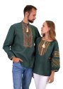 Сорочка вишиванка чоловіча Слобожанка - БажанВишиванка виготовлена з натурального льону насиченого зеленого кольору: це символ народження, зростання та процвітання. Кольори вишивки – золотавий, коричневий та помаранчевий. Акуратна вишивка хрестиком розміщена спереду вишиванки, на комірці та манжетах. Модель оснащена китицями на зав'язках. Характер орнаменту: геометричний Символіка: Ромб - ромб один з найпопулярніших орнаментів, втілюють за старовинними повір'ями богиню землі. Вважається дуже сильним охоронним знаком, що дарує щастя і родючість. Загальна інформація Виготовлено в Україні. Догляд: Прання:
