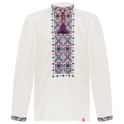 Чоловіча вишиванка Фолк мода (1402)Ця чоловіча ллянна сорочка вершкового кольору в поєднанні з кольоровою вишивкою це справжня знахідка для кожного чоловіка. Геометричний візерунок виконаний гладдю. Від вишитого комірця оздоблення широкою довгою смугою прямує вниз. Манжети, на яких повторюється візерунок коміру, мають застібку у вигляді дерев'яних ґудзиків.Загальна інформація Тканина: 100% льон . Техніка виконання вишивки: гладь Догляд: Прання: