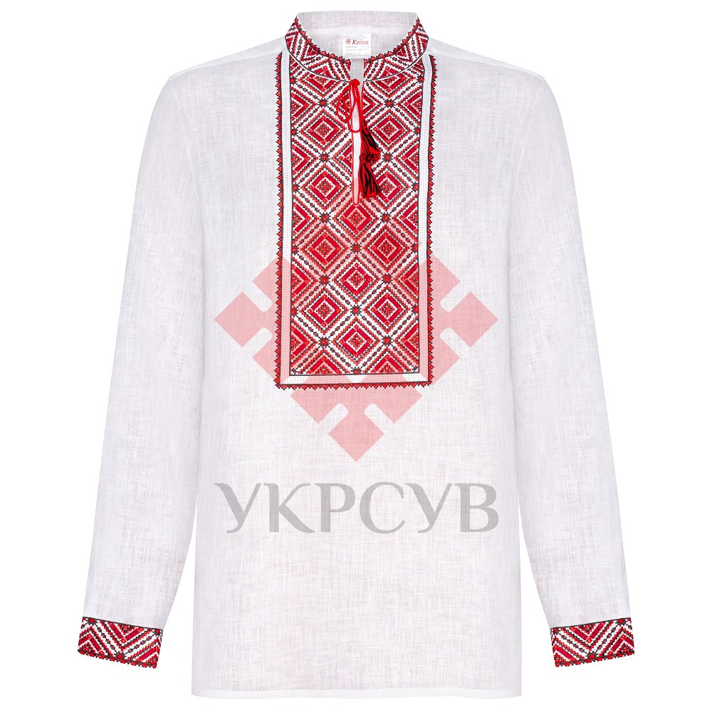Сорочка вишиванка чоловіча "Колос" - ЩедрістьВишиванка виготовлена з натурального льону білого кольору: це символ чистоти і життєвої енергії. За стародавнім повір'ям така вишиванка дарує своєму власникові душевну рівновагу і здоров'я. Кольори вишивки – чорний, червоний. Червоний колір у вишивці означає радість, пристрасть, любов і життєлюбність. Чорний - символ годувальниці землі, родючості і достатку. Характер орнаменту: геометричний Символіка: Ромб - ромб один з найпопулярніших орнаментів, втілюють за старовинними повір'ями богиню землі. Вважається дуже сильним охоронним знаком, що дарує щастя і родючість. Загальна інформація Виготовлено в Україні. Догляд: Прання: