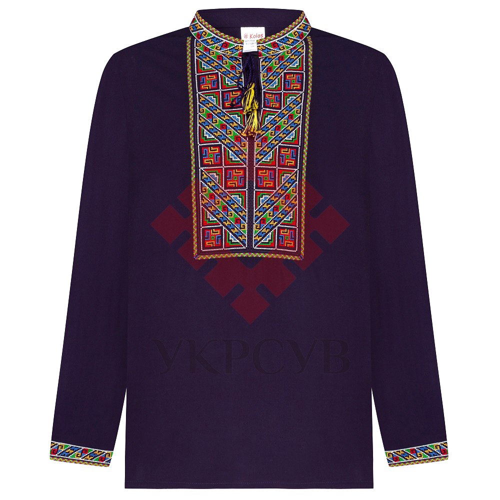 Сорочка вишиванка для хлопчика Колос - КольороваДитяча вишиванка в темно-синьому кольорі поєднала в собі давні традиції та сучасні тенденції. Яскравий геометричний візерунок розміщений спереду сорочки, на комірці та на манжетах. Візерунок виконаний машинною вишивкою у техніці "хрестик". Загальна інформація Тканина: 100% віскоза Догляд: Прання: