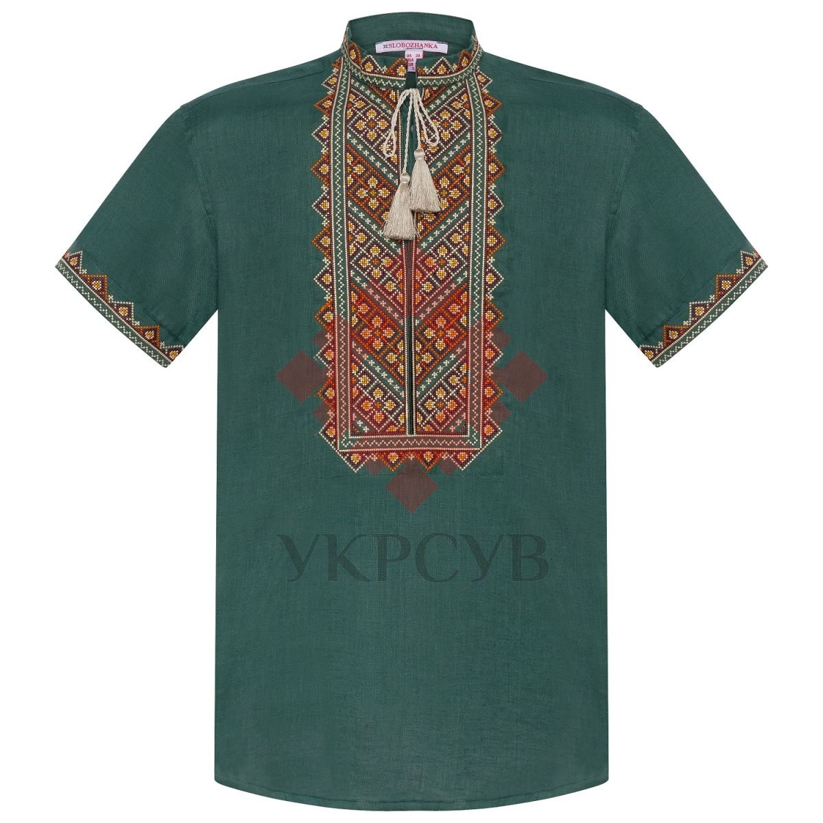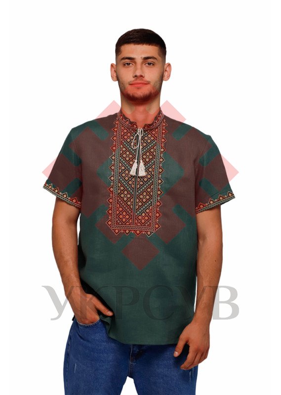 Теніска чоловіча Слобожанка - Бажан (зелена)Сорочка пошита з високоякісного льону насиченого зеленого кольору (100%) та прикрашена традиційним візерунком, що виконаний у техніці "хрестик". Характер орнаменту: геометричний Загальна інформація Тканина: Льон Догляд: Прання: