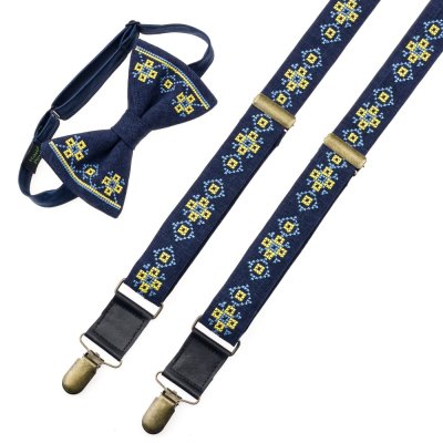 Вишиті підтяжки з метеликом - №955Вишитий набір складається з вишитих підтяжок та вишитого метелика. Вироби виготовлені з костюмної тканини синього кольору з елегантними вставками зі шкіри. Метелик оснащений зручною застібкою та регулятором довжини, що значно спрощує його використання, особливо в непередбачених ситуаціях. Довжина підтяжок регулюється приблизно до 120 см, ширина становить 3 см. Металева фурнітура високої якості забезпечує надійну фіксацію. Цей вишитий набір запакований у фірмову упаковку ручної роботи, виготовлену з чорного дизайнерського картону.