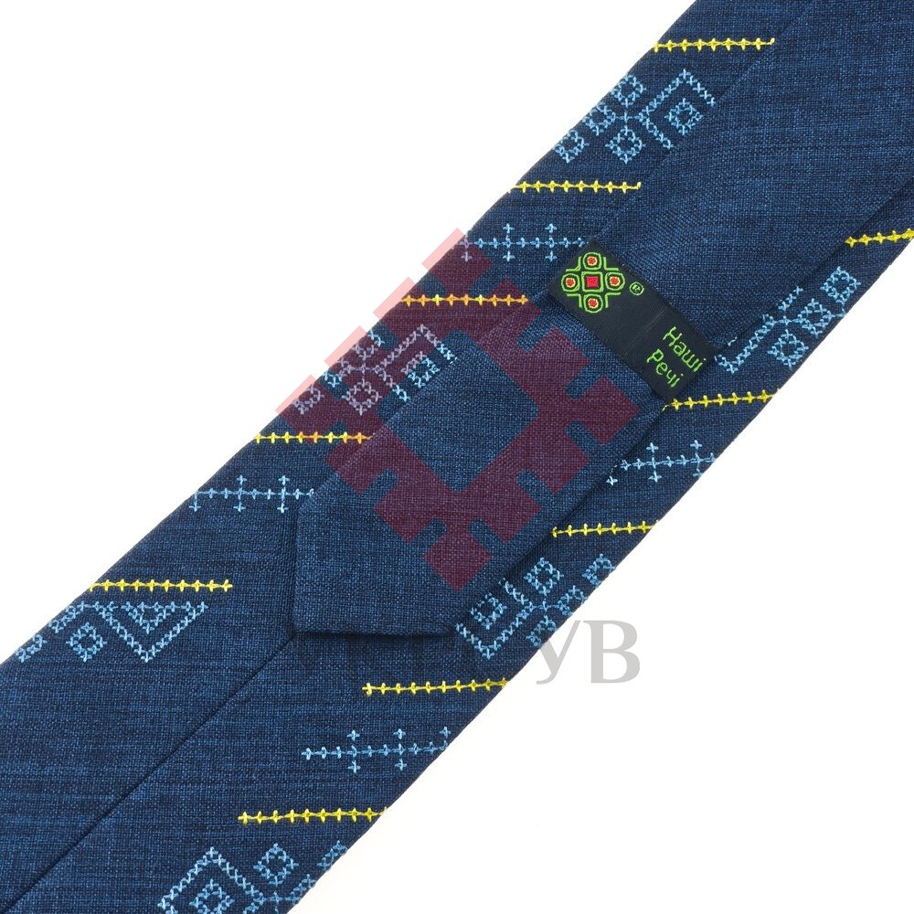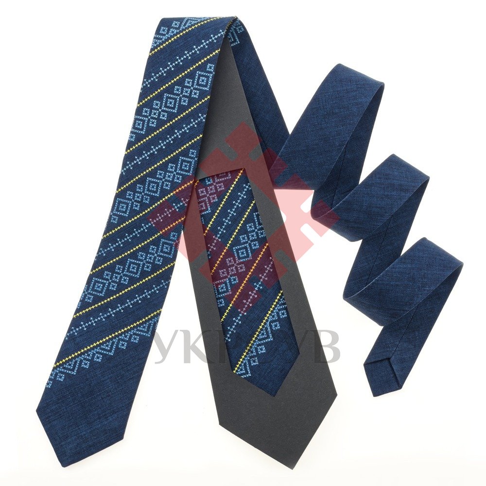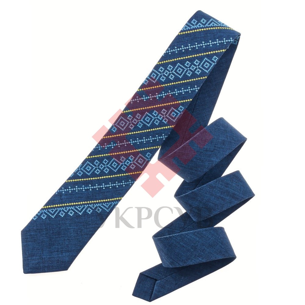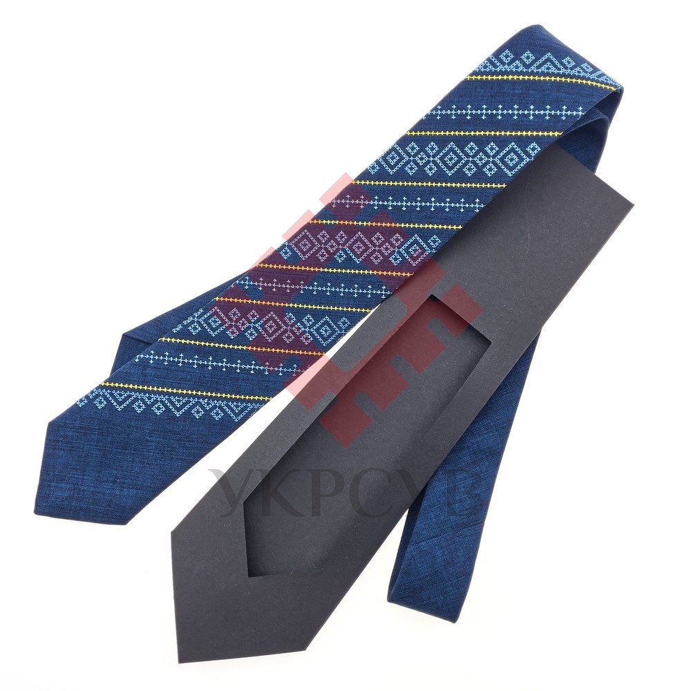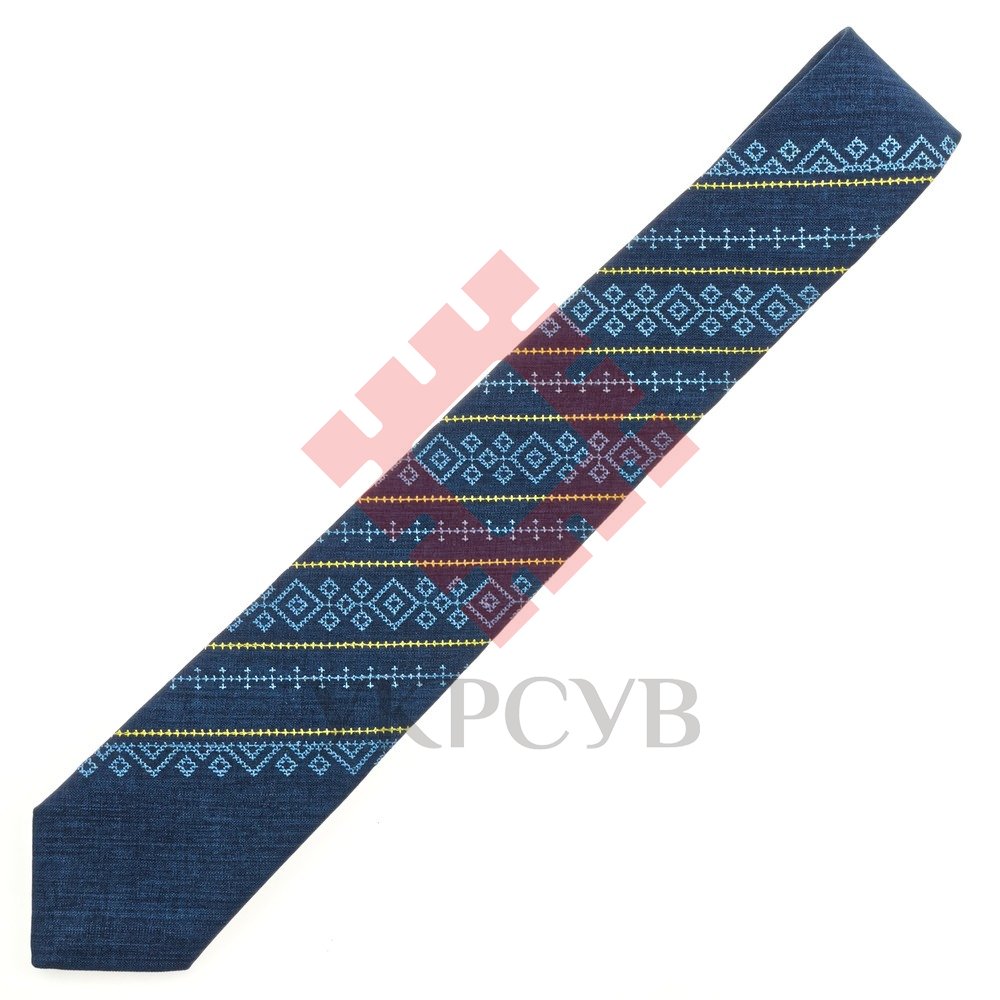 Вишита краватка – це унікальний подарунок для керівника, друга чи колеги по роботі. Вона є необхідним аксесуаром для ділової людини. Краватка виготовлена з костюмної тканини синього кольору, класичного крою. Довжина виробу – 145 см.