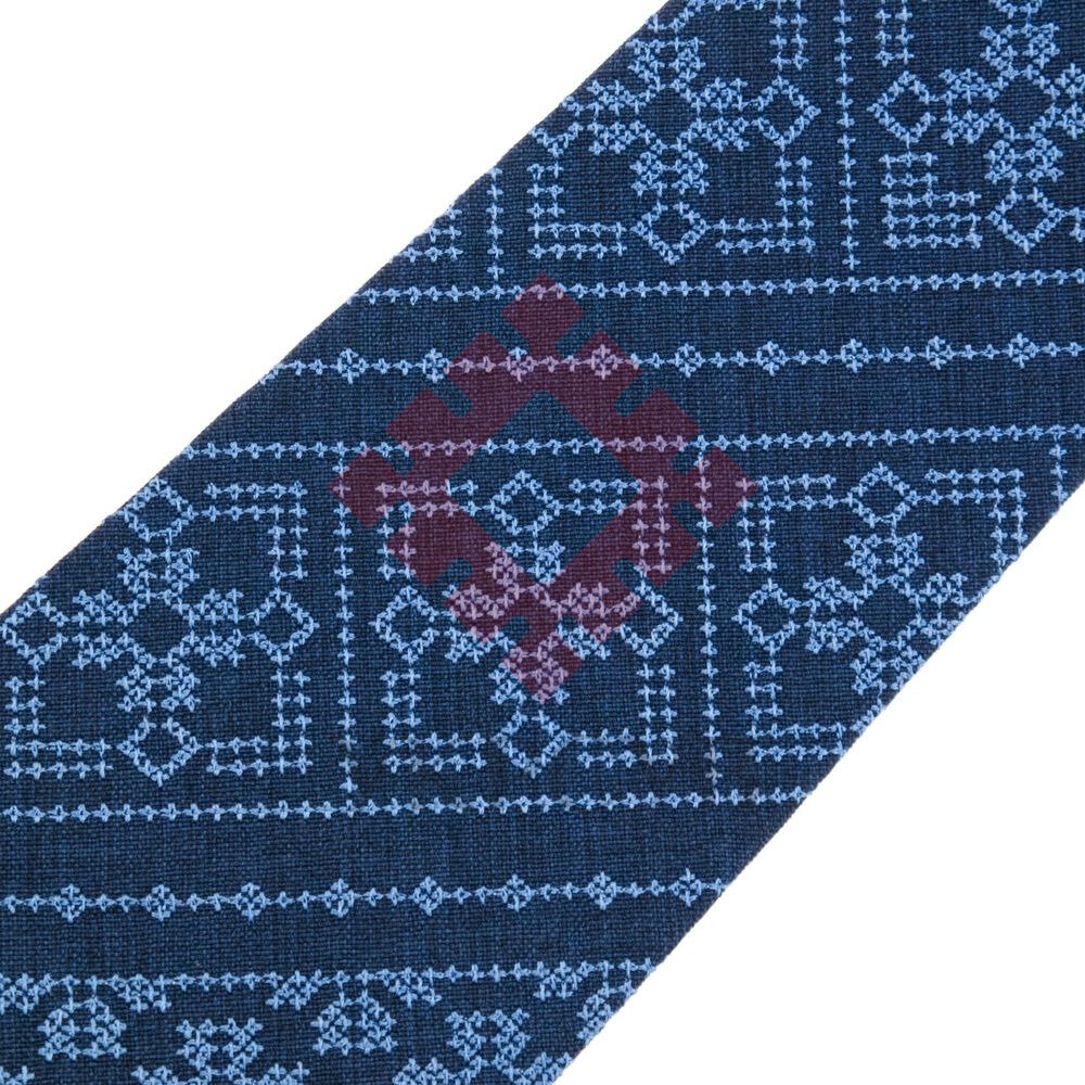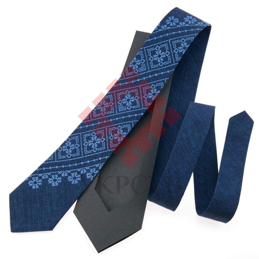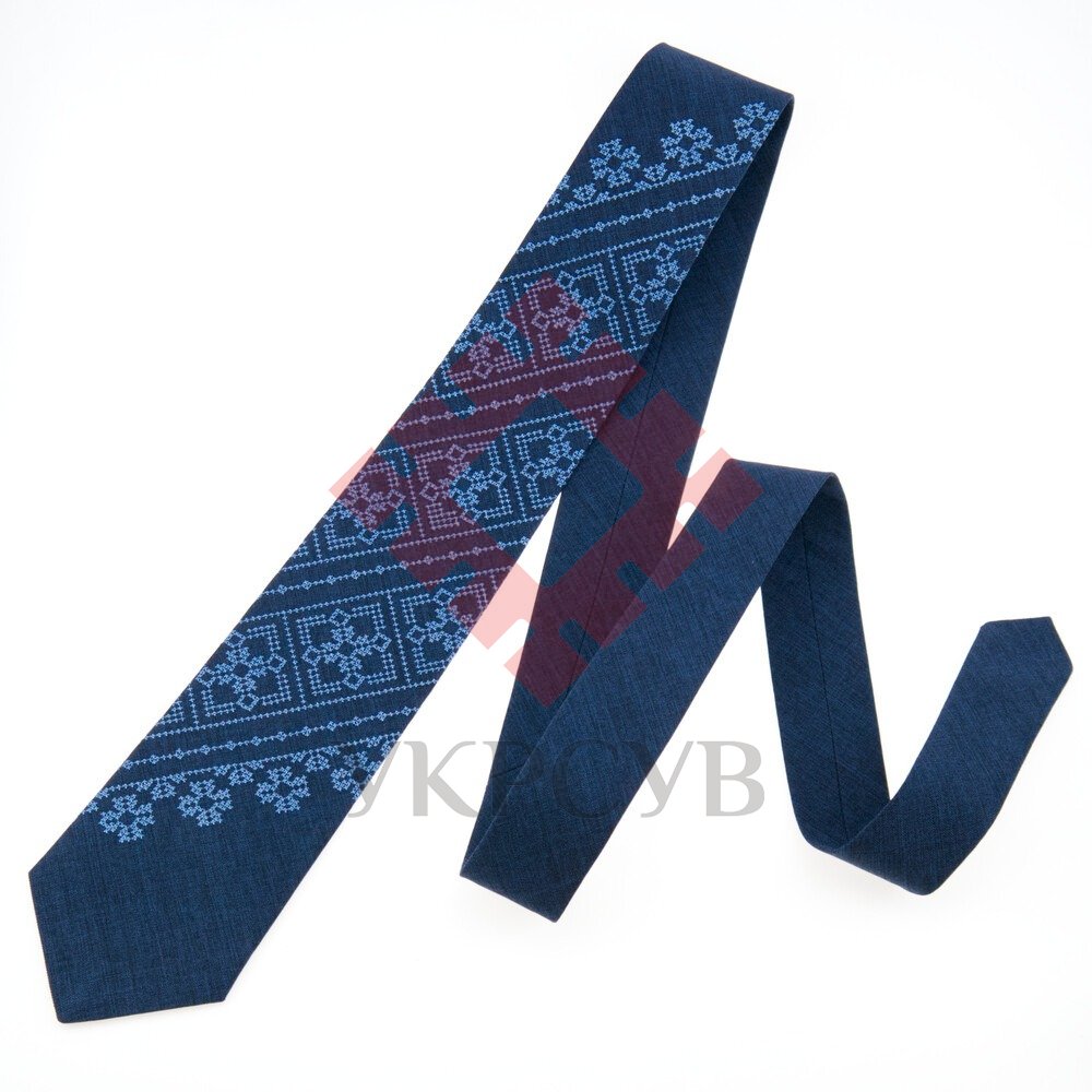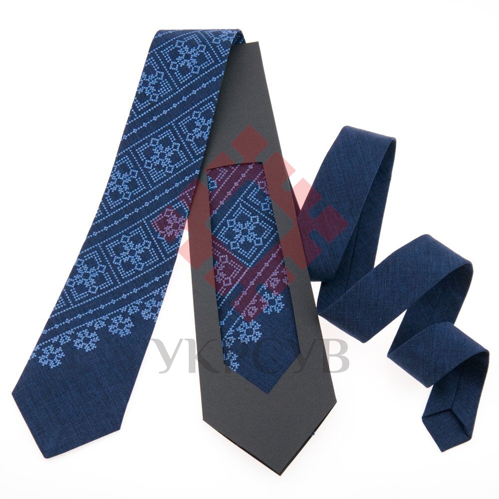 Вишита краватка – це унікальний подарунок для керівника, друга чи колеги по роботі. Вона є необхідним аксесуаром для ділової людини. Краватка виготовлена з костюмної тканини синього кольору, класичного крою. Довжина виробу – 145 см.