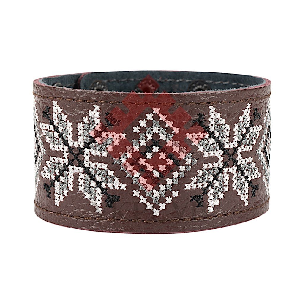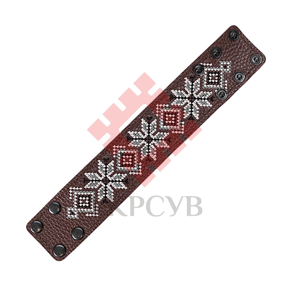 Браслет "Вишивка" (40 мм, бордовий, №08)Представляємо елегантний та стильний браслет "Вишивка", що поєднує в собі красу традиційних українських мотивів та сучасний дизайн. Цей аксесуар стане чудовим доповненням до вашого образу, додаючи йому унікальності та національного колориту. Браслет виготовлений з натуральної шкіри, що гарантує його високу якість, довговічність та комфортне носіння. Основа прикрашена яскравою та чіткою машинною вишивкою, виконаною з особливою увагою до деталей, що відтворює багаті орнаменти української вишивки. Кожен візерунок несе в собі глибокий символізм, роблячи браслет не просто прикрасою, а справжнім оберегом. Завдяки зручній застібці на кнопках, браслет легко одягається та надійно фіксується на зап'ясті. Ми подбали про те, щоб ви могли підібрати ідеальний розмір: браслет має кілька положень для регулювання обхвату. Цей браслет – ідеальний вибір для тих, хто цінує якість та бажає підкреслити свою індивідуальність. Він чудово поєднується як з повсякденним одягом, так і з більш вишуканим вбранням в етно-стилі. Характеристики: