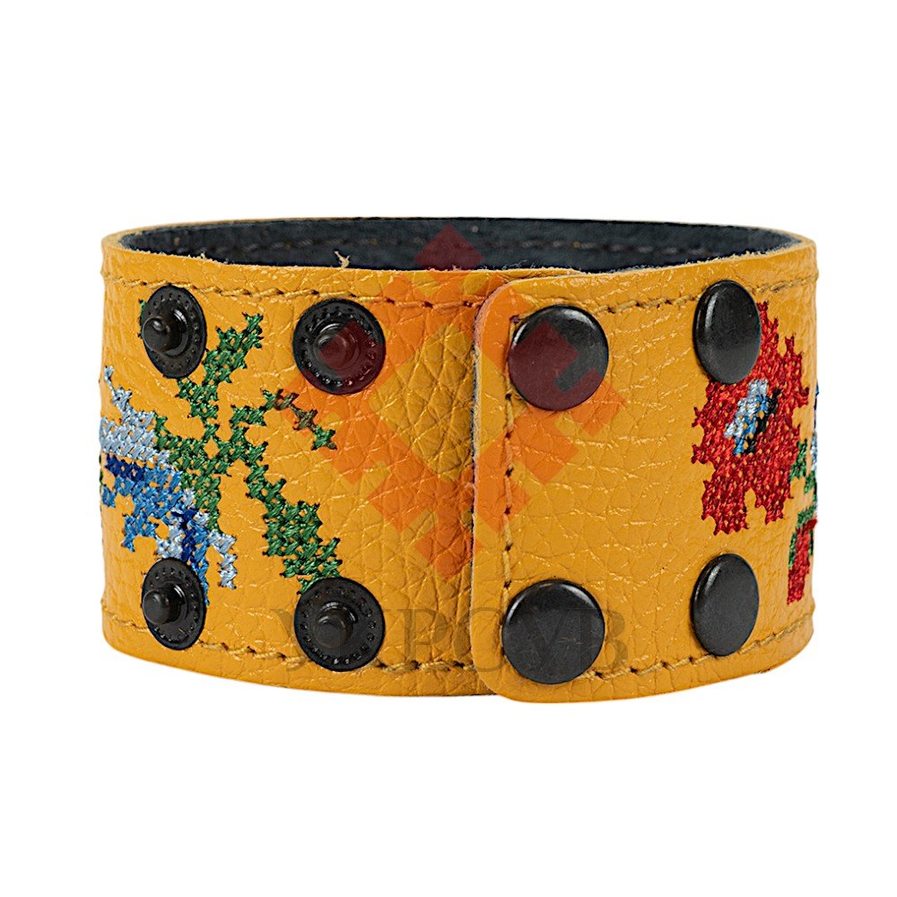 Браслет "Вишивка" (40 мм, жовтий, №02)Представляємо елегантний та стильний браслет "Вишивка", що поєднує в собі красу традиційних українських мотивів та сучасний дизайн. Цей аксесуар стане чудовим доповненням до вашого образу, додаючи йому унікальності та національного колориту. Браслет виготовлений з натуральної шкіри, що гарантує його високу якість, довговічність та комфортне носіння. Основа прикрашена яскравою та чіткою машинною вишивкою, виконаною з особливою увагою до деталей, що відтворює багаті орнаменти української вишивки. Кожен візерунок несе в собі глибокий символізм, роблячи браслет не просто прикрасою, а справжнім оберегом. Завдяки зручній застібці на кнопках, браслет легко одягається та надійно фіксується на зап'ясті. Ми подбали про те, щоб ви могли підібрати ідеальний розмір: браслет має кілька положень для регулювання обхвату. Цей браслет – ідеальний вибір для тих, хто цінує якість та бажає підкреслити свою індивідуальність. Він чудово поєднується як з повсякденним одягом, так і з більш вишуканим вбранням в етно-стилі. Характеристики:
