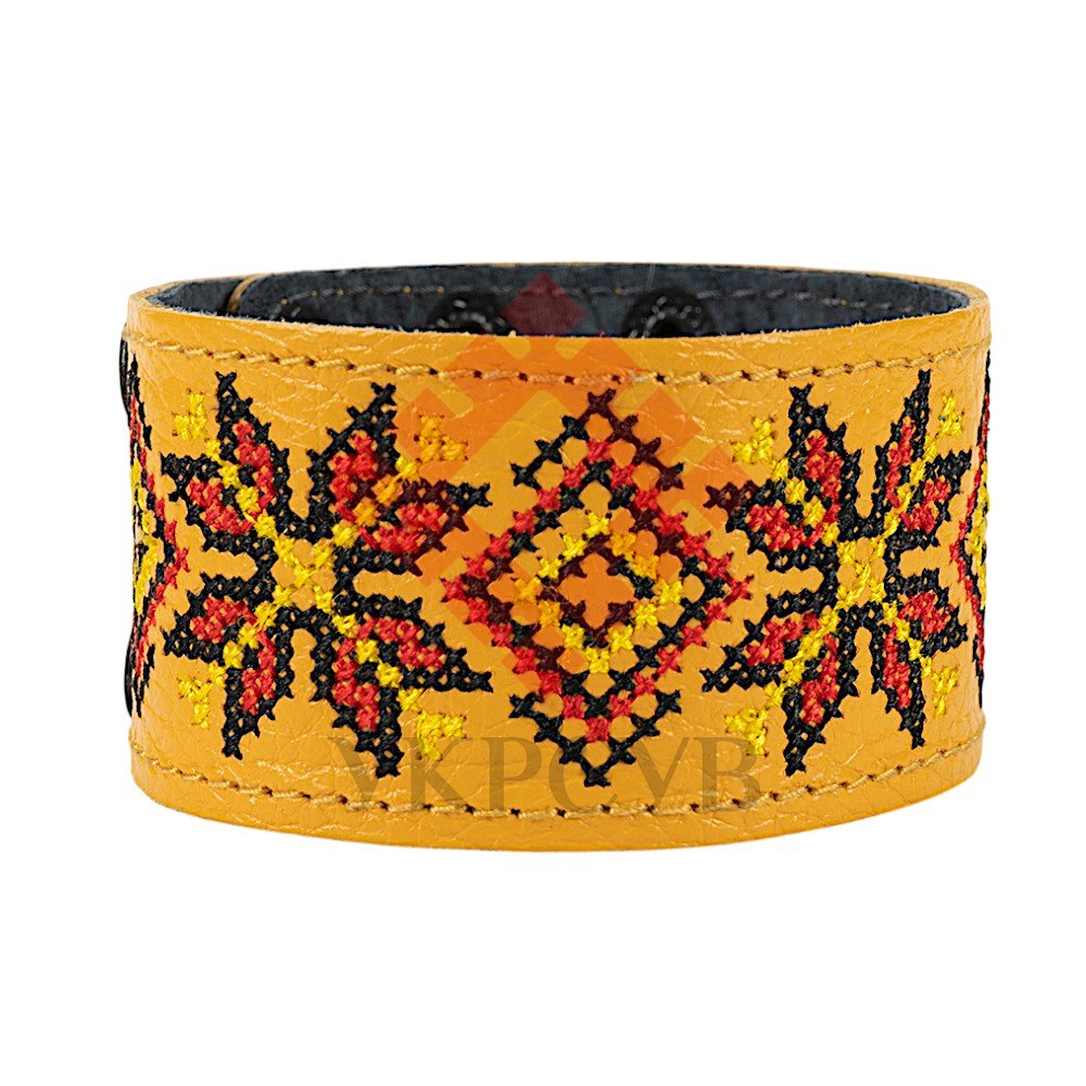 Браслет "Вишивка" (40 мм, жовтий, №07)Представляємо елегантний та стильний браслет "Вишивка", що поєднує в собі красу традиційних українських мотивів та сучасний дизайн. Цей аксесуар стане чудовим доповненням до вашого образу, додаючи йому унікальності та національного колориту. Браслет виготовлений з натуральної шкіри, що гарантує його високу якість, довговічність та комфортне носіння. Основа прикрашена яскравою та чіткою машинною вишивкою, виконаною з особливою увагою до деталей, що відтворює багаті орнаменти української вишивки. Кожен візерунок несе в собі глибокий символізм, роблячи браслет не просто прикрасою, а справжнім оберегом. Завдяки зручній застібці на кнопках, браслет легко одягається та надійно фіксується на зап'ясті. Ми подбали про те, щоб ви могли підібрати ідеальний розмір: браслет має кілька положень для регулювання обхвату. Цей браслет – ідеальний вибір для тих, хто цінує якість та бажає підкреслити свою індивідуальність. Він чудово поєднується як з повсякденним одягом, так і з більш вишуканим вбранням в етно-стилі. Характеристики: