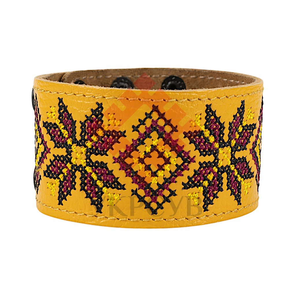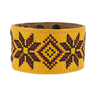 Браслет "Вишивка" (40 мм, жовтий, №09)Представляємо елегантний та стильний браслет "Вишивка", що поєднує в собі красу традиційних українських мотивів та сучасний дизайн. Цей аксесуар стане чудовим доповненням до вашого образу, додаючи йому унікальності та національного колориту. Браслет виготовлений з натуральної шкіри, що гарантує його високу якість, довговічність та комфортне носіння. Основа прикрашена яскравою та чіткою машинною вишивкою, виконаною з особливою увагою до деталей, що відтворює багаті орнаменти української вишивки. Кожен візерунок несе в собі глибокий символізм, роблячи браслет не просто прикрасою, а справжнім оберегом. Завдяки зручній застібці на кнопках, браслет легко одягається та надійно фіксується на зап'ясті. Ми подбали про те, щоб ви могли підібрати ідеальний розмір: браслет має кілька положень для регулювання обхвату. Цей браслет – ідеальний вибір для тих, хто цінує якість та бажає підкреслити свою індивідуальність. Він чудово поєднується як з повсякденним одягом, так і з більш вишуканим вбранням в етно-стилі. Характеристики: