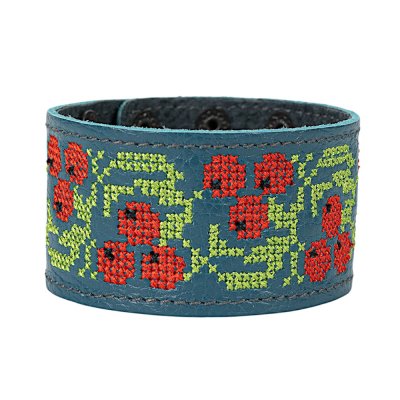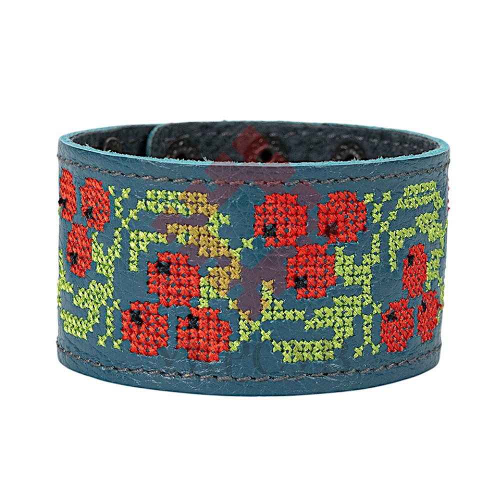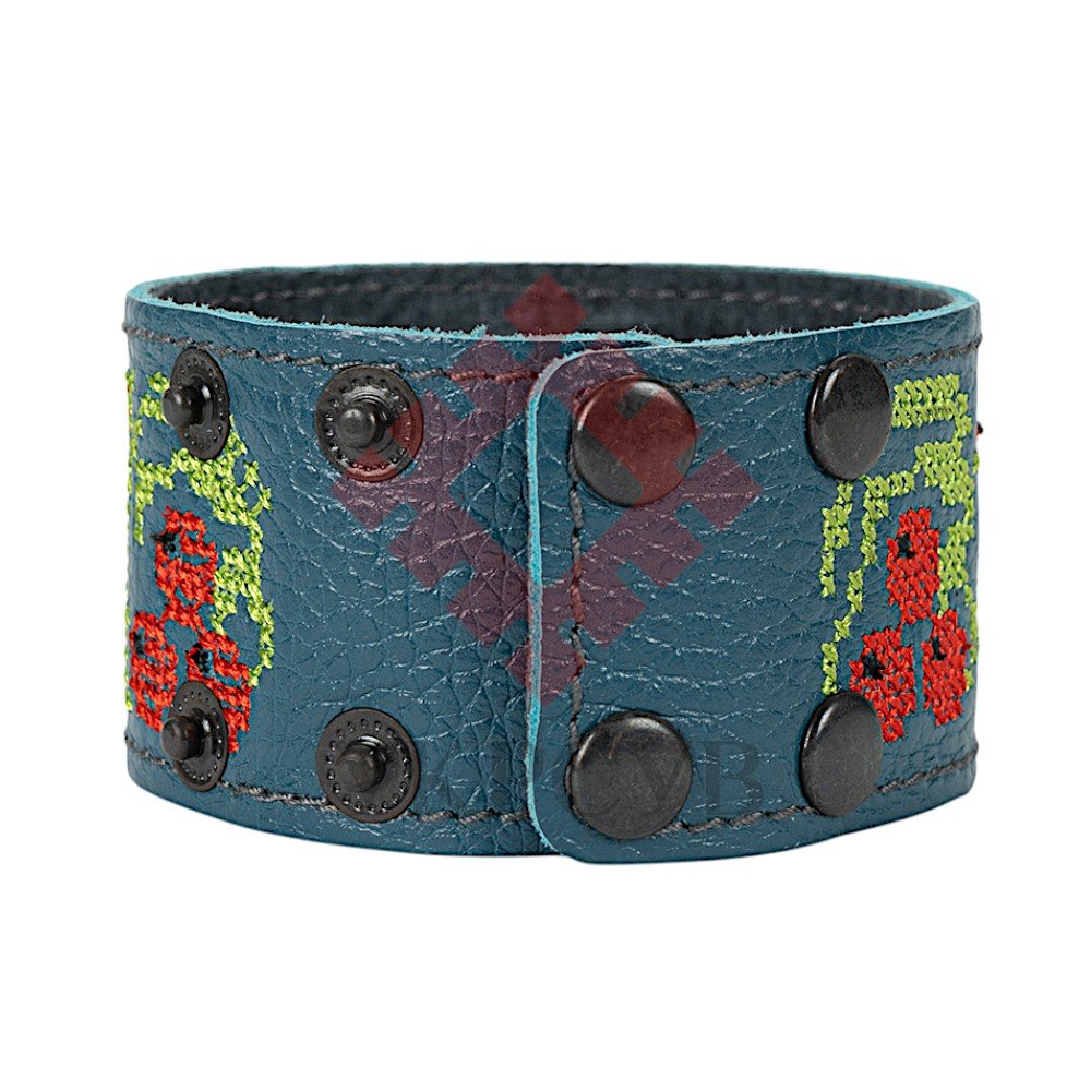 Браслет "Вишивка" (40 мм, синій, №01)Представляємо елегантний та стильний браслет "Вишивка", що поєднує в собі красу традиційних українських мотивів та сучасний дизайн. Цей аксесуар стане чудовим доповненням до вашого образу, додаючи йому унікальності та національного колориту. Браслет виготовлений з натуральної шкіри, що гарантує його високу якість, довговічність та комфортне носіння. Основа прикрашена яскравою та чіткою машинною вишивкою, виконаною з особливою увагою до деталей, що відтворює багаті орнаменти української вишивки. Кожен візерунок несе в собі глибокий символізм, роблячи браслет не просто прикрасою, а справжнім оберегом. Завдяки зручній застібці на кнопках, браслет легко одягається та надійно фіксується на зап'ясті. Ми подбали про те, щоб ви могли підібрати ідеальний розмір: браслет має кілька положень для регулювання обхвату. Цей браслет – ідеальний вибір для тих, хто цінує якість та бажає підкреслити свою індивідуальність. Він чудово поєднується як з повсякденним одягом, так і з більш вишуканим вбранням в етно-стилі. Характеристики: