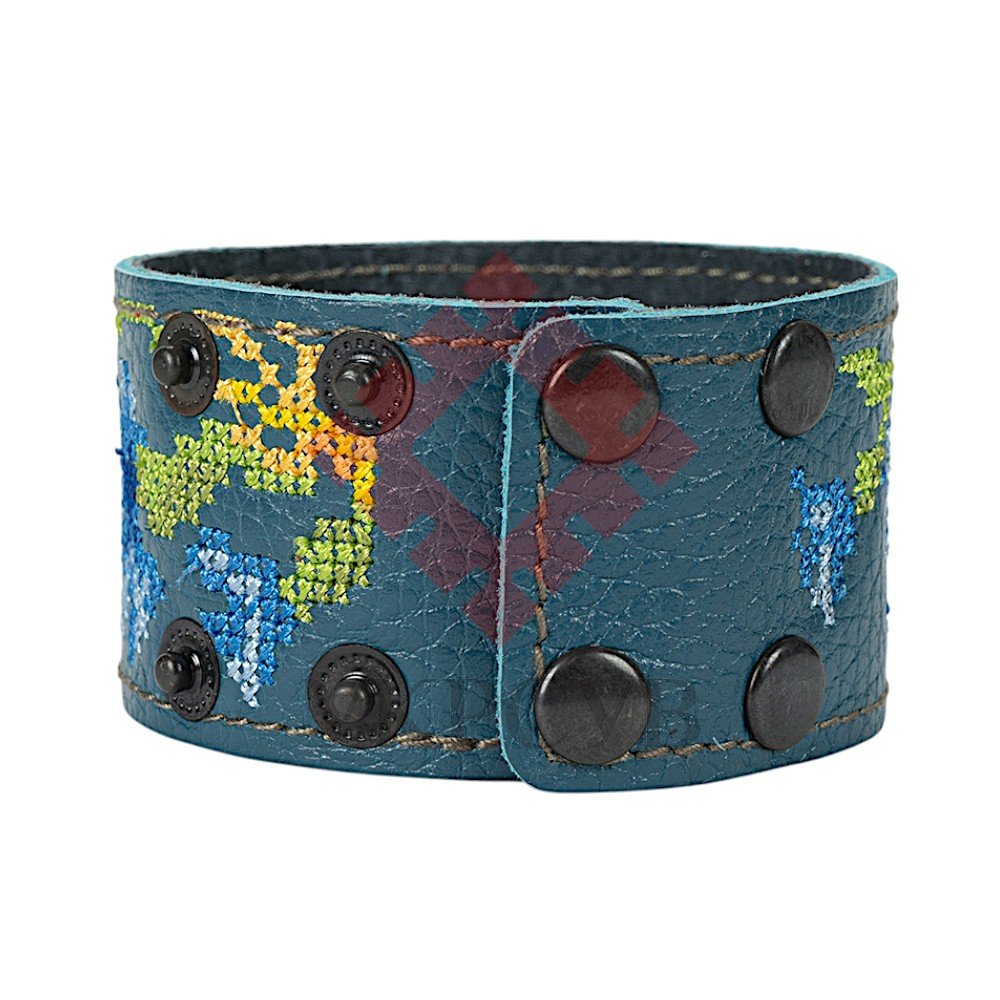 Браслет "Вишивка" (40 мм, синій, №02)Представляємо елегантний та стильний браслет "Вишивка", що поєднує в собі красу традиційних українських мотивів та сучасний дизайн. Цей аксесуар стане чудовим доповненням до вашого образу, додаючи йому унікальності та національного колориту. Браслет виготовлений з натуральної шкіри, що гарантує його високу якість, довговічність та комфортне носіння. Основа прикрашена яскравою та чіткою машинною вишивкою, виконаною з особливою увагою до деталей, що відтворює багаті орнаменти української вишивки. Кожен візерунок несе в собі глибокий символізм, роблячи браслет не просто прикрасою, а справжнім оберегом. Завдяки зручній застібці на кнопках, браслет легко одягається та надійно фіксується на зап'ясті. Ми подбали про те, щоб ви могли підібрати ідеальний розмір: браслет має кілька положень для регулювання обхвату. Цей браслет – ідеальний вибір для тих, хто цінує якість та бажає підкреслити свою індивідуальність. Він чудово поєднується як з повсякденним одягом, так і з більш вишуканим вбранням в етно-стилі. Характеристики: