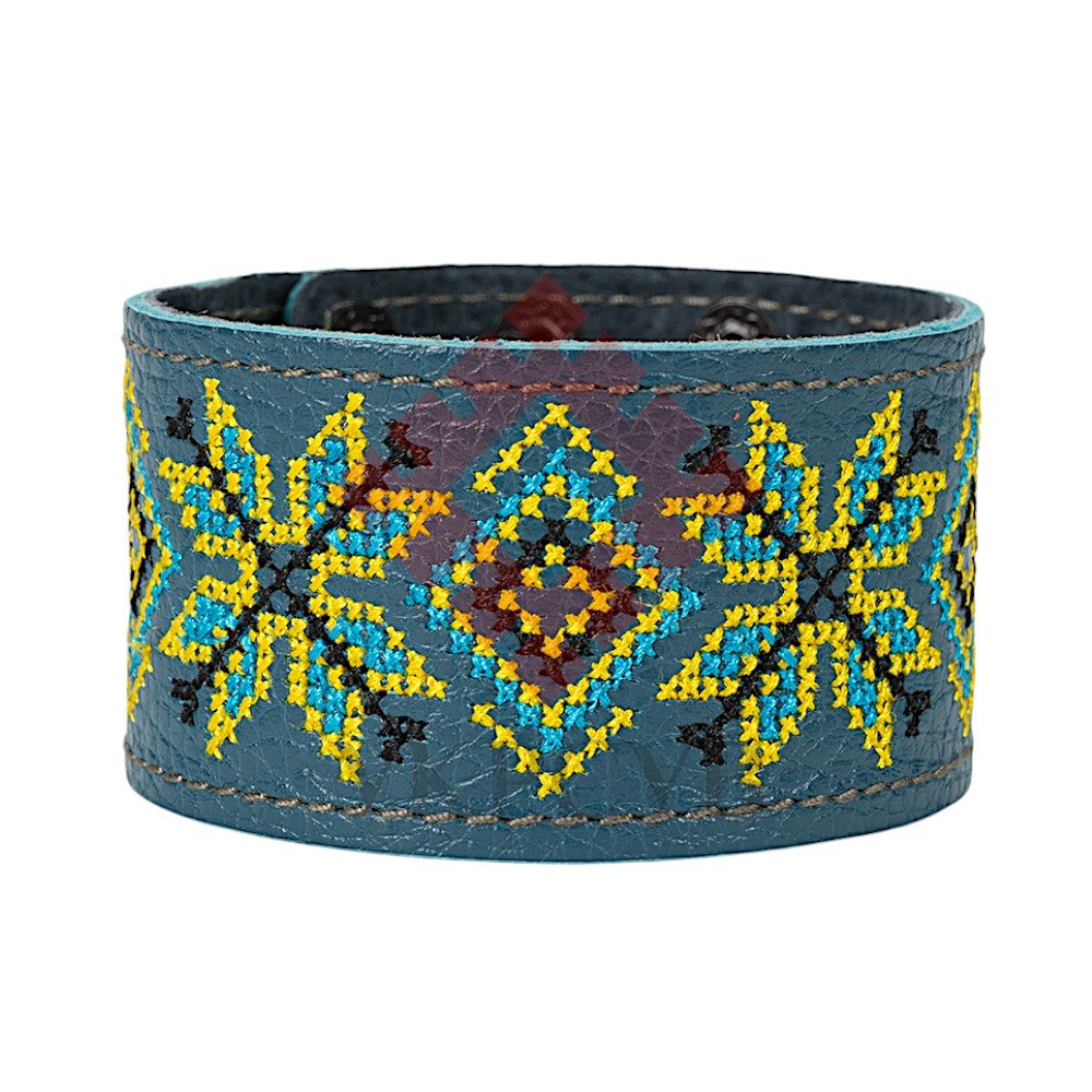 Браслет "Вишивка" (40 мм, синій, №06)Представляємо елегантний та стильний браслет "Вишивка", що поєднує в собі красу традиційних українських мотивів та сучасний дизайн. Цей аксесуар стане чудовим доповненням до вашого образу, додаючи йому унікальності та національного колориту. Браслет виготовлений з натуральної шкіри, що гарантує його високу якість, довговічність та комфортне носіння. Основа прикрашена яскравою та чіткою машинною вишивкою, виконаною з особливою увагою до деталей, що відтворює багаті орнаменти української вишивки. Кожен візерунок несе в собі глибокий символізм, роблячи браслет не просто прикрасою, а справжнім оберегом. Завдяки зручній застібці на кнопках, браслет легко одягається та надійно фіксується на зап'ясті. Ми подбали про те, щоб ви могли підібрати ідеальний розмір: браслет має кілька положень для регулювання обхвату. Цей браслет – ідеальний вибір для тих, хто цінує якість та бажає підкреслити свою індивідуальність. Він чудово поєднується як з повсякденним одягом, так і з більш вишуканим вбранням в етно-стилі. Характеристики: