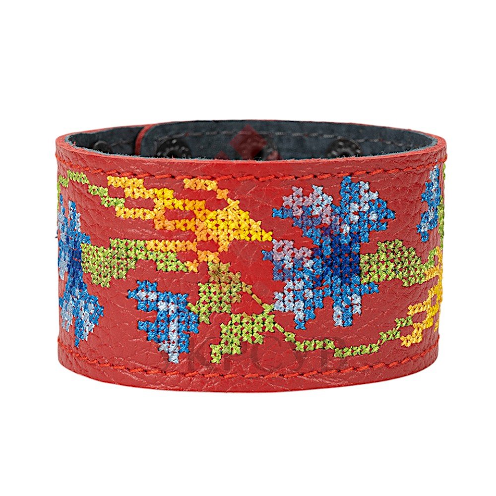 Браслет "Вишивка" (40 мм, червоний, №01)Представляємо елегантний та стильний браслет "Вишивка", що поєднує в собі красу традиційних українських мотивів та сучасний дизайн. Цей аксесуар стане чудовим доповненням до вашого образу, додаючи йому унікальності та національного колориту. Браслет виготовлений з натуральної шкіри, що гарантує його високу якість, довговічність та комфортне носіння. Основа прикрашена яскравою та чіткою машинною вишивкою, виконаною з особливою увагою до деталей, що відтворює багаті орнаменти української вишивки. Кожен візерунок несе в собі глибокий символізм, роблячи браслет не просто прикрасою, а справжнім оберегом. Завдяки зручній застібці на кнопках, браслет легко одягається та надійно фіксується на зап'ясті. Ми подбали про те, щоб ви могли підібрати ідеальний розмір: браслет має кілька положень для регулювання обхвату. Цей браслет – ідеальний вибір для тих, хто цінує якість та бажає підкреслити свою індивідуальність. Він чудово поєднується як з повсякденним одягом, так і з більш вишуканим вбранням в етно-стилі. Характеристики: