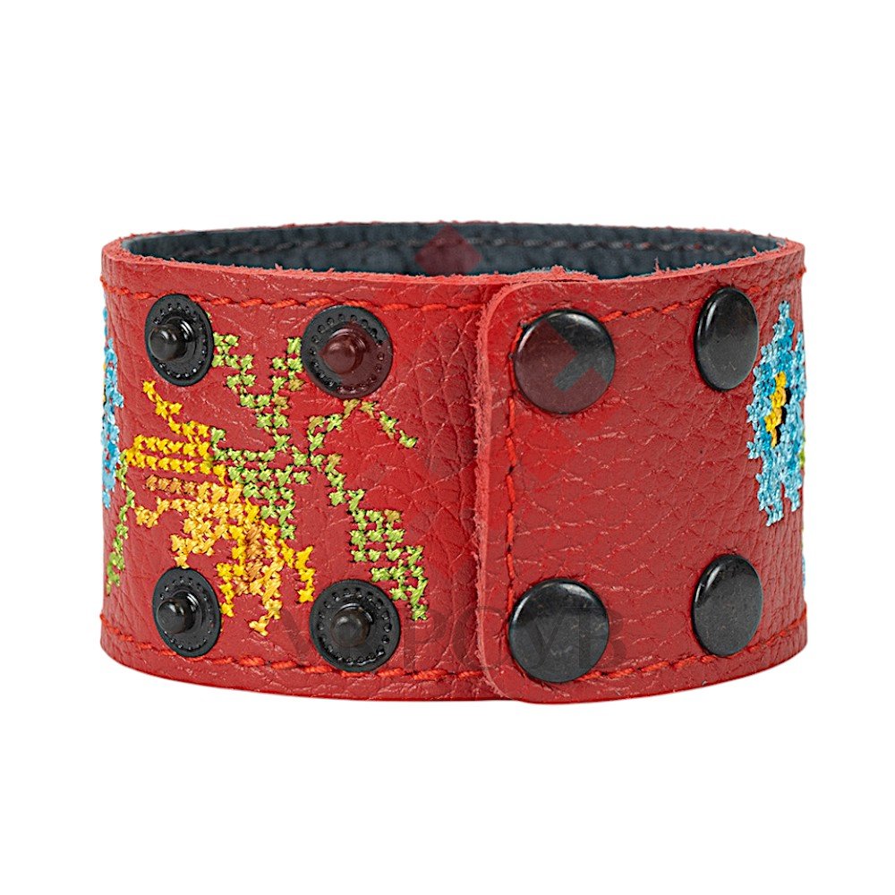 Браслет "Вишивка" (40 мм, червоний, №04)Представляємо елегантний та стильний браслет "Вишивка", що поєднує в собі красу традиційних українських мотивів та сучасний дизайн. Цей аксесуар стане чудовим доповненням до вашого образу, додаючи йому унікальності та національного колориту. Браслет виготовлений з натуральної шкіри, що гарантує його високу якість, довговічність та комфортне носіння. Основа прикрашена яскравою та чіткою машинною вишивкою, виконаною з особливою увагою до деталей, що відтворює багаті орнаменти української вишивки. Кожен візерунок несе в собі глибокий символізм, роблячи браслет не просто прикрасою, а справжнім оберегом. Завдяки зручній застібці на кнопках, браслет легко одягається та надійно фіксується на зап'ясті. Ми подбали про те, щоб ви могли підібрати ідеальний розмір: браслет має кілька положень для регулювання обхвату. Цей браслет – ідеальний вибір для тих, хто цінує якість та бажає підкреслити свою індивідуальність. Він чудово поєднується як з повсякденним одягом, так і з більш вишуканим вбранням в етно-стилі. Характеристики: