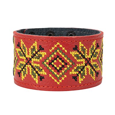 Браслет "Вишивка" (40 мм, червоний, №07)Представляємо елегантний та стильний браслет "Вишивка", що поєднує в собі красу традиційних українських мотивів та сучасний дизайн. Цей аксесуар стане чудовим доповненням до вашого образу, додаючи йому унікальності та національного колориту. Браслет виготовлений з натуральної шкіри, що гарантує його високу якість, довговічність та комфортне носіння. Основа прикрашена яскравою та чіткою машинною вишивкою, виконаною з особливою увагою до деталей, що відтворює багаті орнаменти української вишивки. Кожен візерунок несе в собі глибокий символізм, роблячи браслет не просто прикрасою, а справжнім оберегом. Завдяки зручній застібці на кнопках, браслет легко одягається та надійно фіксується на зап'ясті. Ми подбали про те, щоб ви могли підібрати ідеальний розмір: браслет має кілька положень для регулювання обхвату. Цей браслет – ідеальний вибір для тих, хто цінує якість та бажає підкреслити свою індивідуальність. Він чудово поєднується як з повсякденним одягом, так і з більш вишуканим вбранням в етно-стилі. Характеристики: