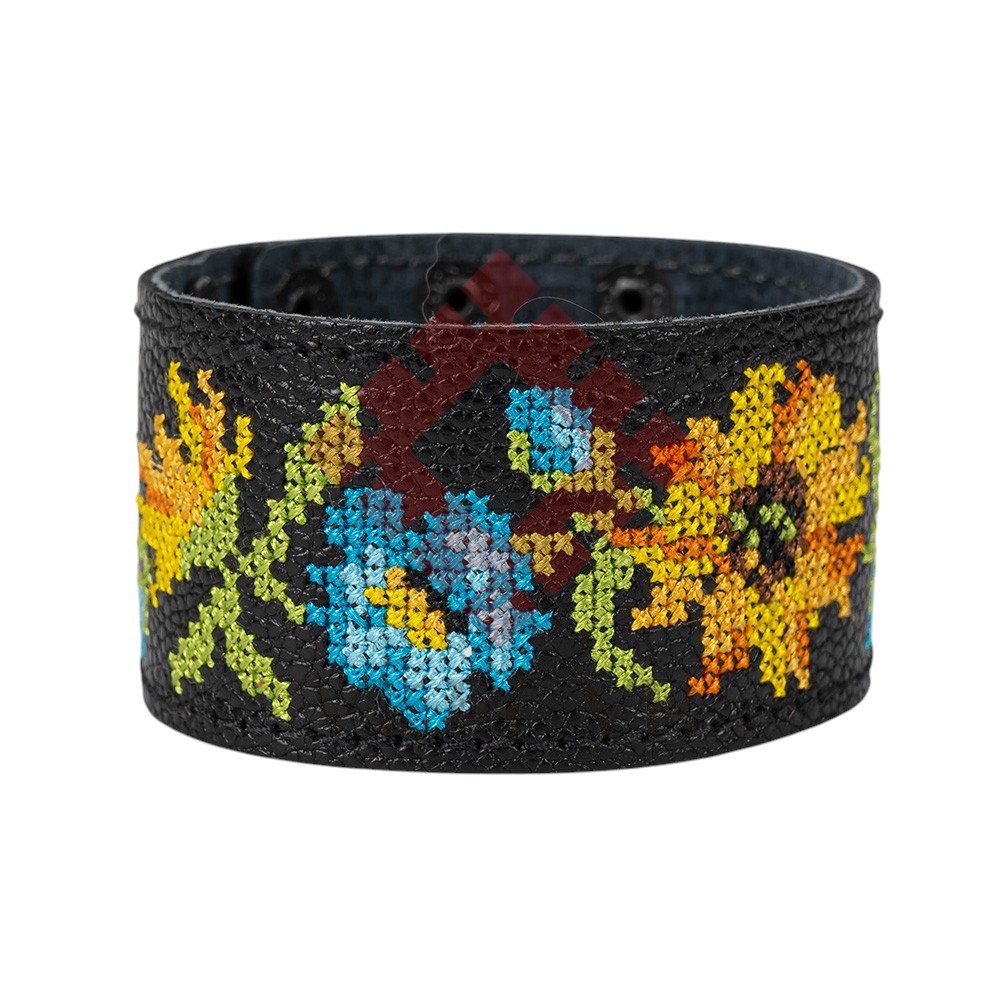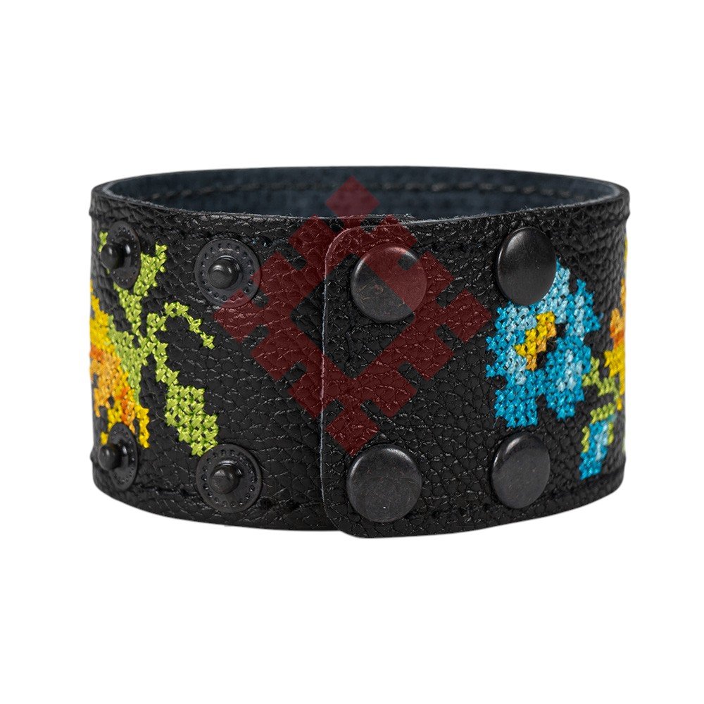 Браслет "Вишивка" (40 мм, чорний, №01)Представляємо елегантний та стильний браслет "Вишивка", що поєднує в собі красу традиційних українських мотивів та сучасний дизайн. Цей аксесуар стане чудовим доповненням до вашого образу, додаючи йому унікальності та національного колориту. Браслет виготовлений з натуральної шкіри, що гарантує його високу якість, довговічність та комфортне носіння. Основа прикрашена яскравою та чіткою машинною вишивкою, виконаною з особливою увагою до деталей, що відтворює багаті орнаменти української вишивки. Кожен візерунок несе в собі глибокий символізм, роблячи браслет не просто прикрасою, а справжнім оберегом. Завдяки зручній застібці на кнопках, браслет легко одягається та надійно фіксується на зап'ясті. Ми подбали про те, щоб ви могли підібрати ідеальний розмір: браслет має кілька положень для регулювання обхвату. Цей браслет – ідеальний вибір для тих, хто цінує якість та бажає підкреслити свою індивідуальність. Він чудово поєднується як з повсякденним одягом, так і з більш вишуканим вбранням в етно-стилі. Характеристики:
