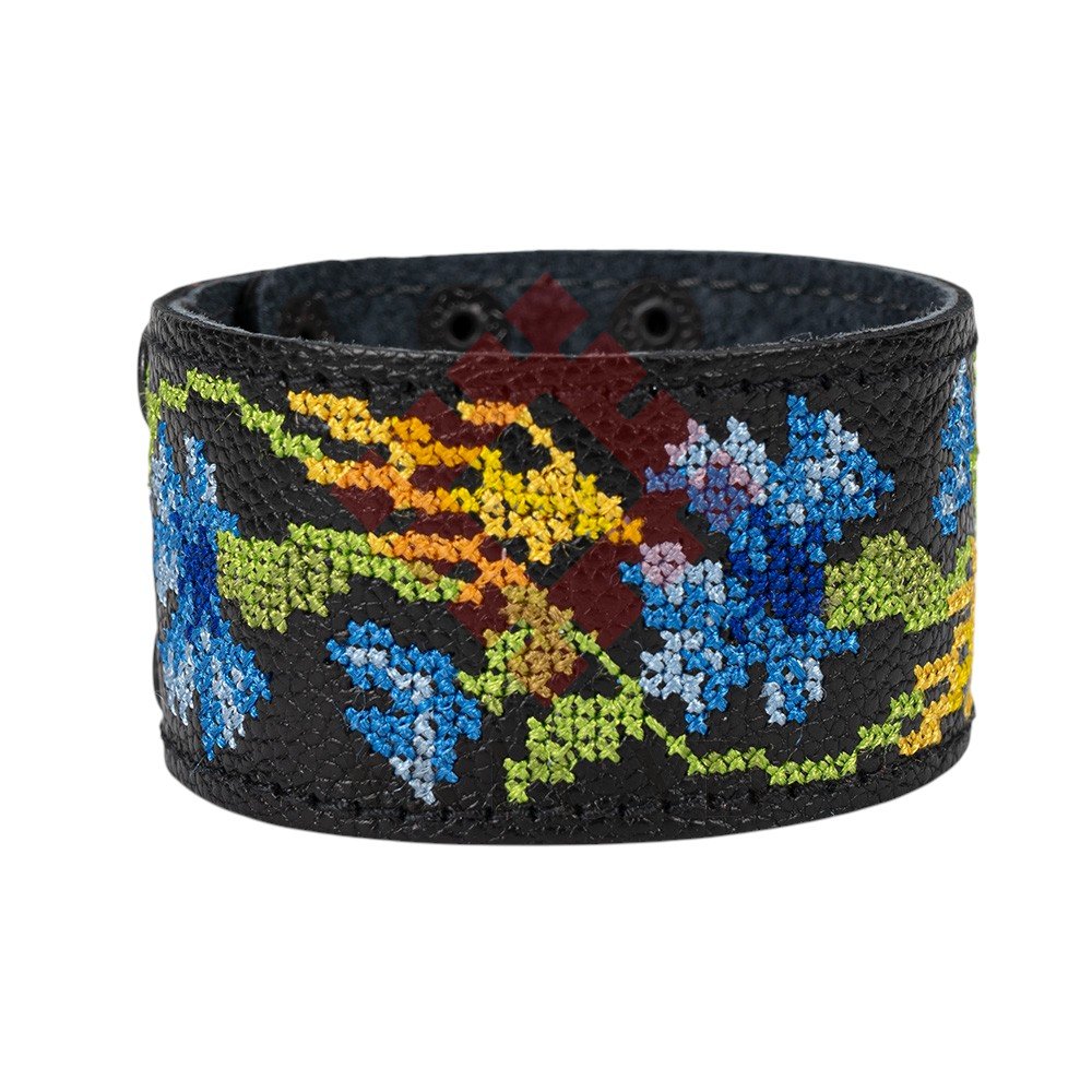 Браслет "Вишивка" (40 мм, чорний, №03)Представляємо елегантний та стильний браслет "Вишивка", що поєднує в собі красу традиційних українських мотивів та сучасний дизайн. Цей аксесуар стане чудовим доповненням до вашого образу, додаючи йому унікальності та національного колориту. Браслет виготовлений з натуральної шкіри, що гарантує його високу якість, довговічність та комфортне носіння. Основа прикрашена яскравою та чіткою машинною вишивкою, виконаною з особливою увагою до деталей, що відтворює багаті орнаменти української вишивки. Кожен візерунок несе в собі глибокий символізм, роблячи браслет не просто прикрасою, а справжнім оберегом. Завдяки зручній застібці на кнопках, браслет легко одягається та надійно фіксується на зап'ясті. Ми подбали про те, щоб ви могли підібрати ідеальний розмір: браслет має кілька положень для регулювання обхвату. Цей браслет – ідеальний вибір для тих, хто цінує якість та бажає підкреслити свою індивідуальність. Він чудово поєднується як з повсякденним одягом, так і з більш вишуканим вбранням в етно-стилі. Характеристики: