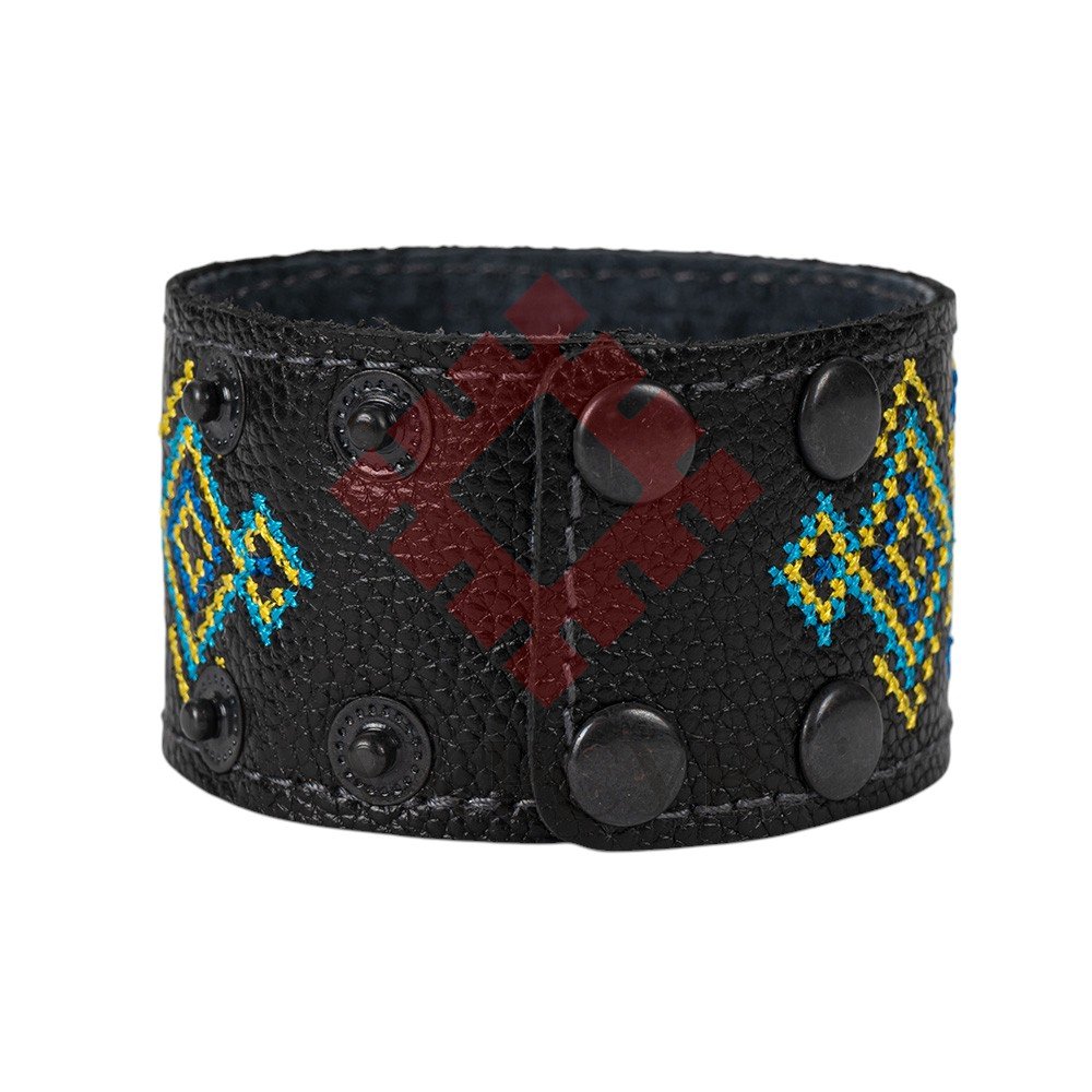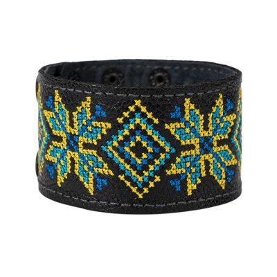 Браслет "Вишивка" (40 мм, чорний, №05)Представляємо елегантний та стильний браслет "Вишивка", що поєднує в собі красу традиційних українських мотивів та сучасний дизайн. Цей аксесуар стане чудовим доповненням до вашого образу, додаючи йому унікальності та національного колориту. Браслет виготовлений з натуральної шкіри, що гарантує його високу якість, довговічність та комфортне носіння. Основа прикрашена яскравою та чіткою машинною вишивкою, виконаною з особливою увагою до деталей, що відтворює багаті орнаменти української вишивки. Кожен візерунок несе в собі глибокий символізм, роблячи браслет не просто прикрасою, а справжнім оберегом. Завдяки зручній застібці на кнопках, браслет легко одягається та надійно фіксується на зап'ясті. Ми подбали про те, щоб ви могли підібрати ідеальний розмір: браслет має кілька положень для регулювання обхвату. Цей браслет – ідеальний вибір для тих, хто цінує якість та бажає підкреслити свою індивідуальність. Він чудово поєднується як з повсякденним одягом, так і з більш вишуканим вбранням в етно-стилі. Характеристики: